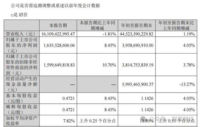 财报数据显示,公司在2025年前三季度的收入为445.2亿元,同比增长1.2%;归母净利润39.59亿元,同比增长4.1%。第三季度收入为161.1亿元,同比下滑1.8%;归母净利润16.36亿元,同比增长8.4%。