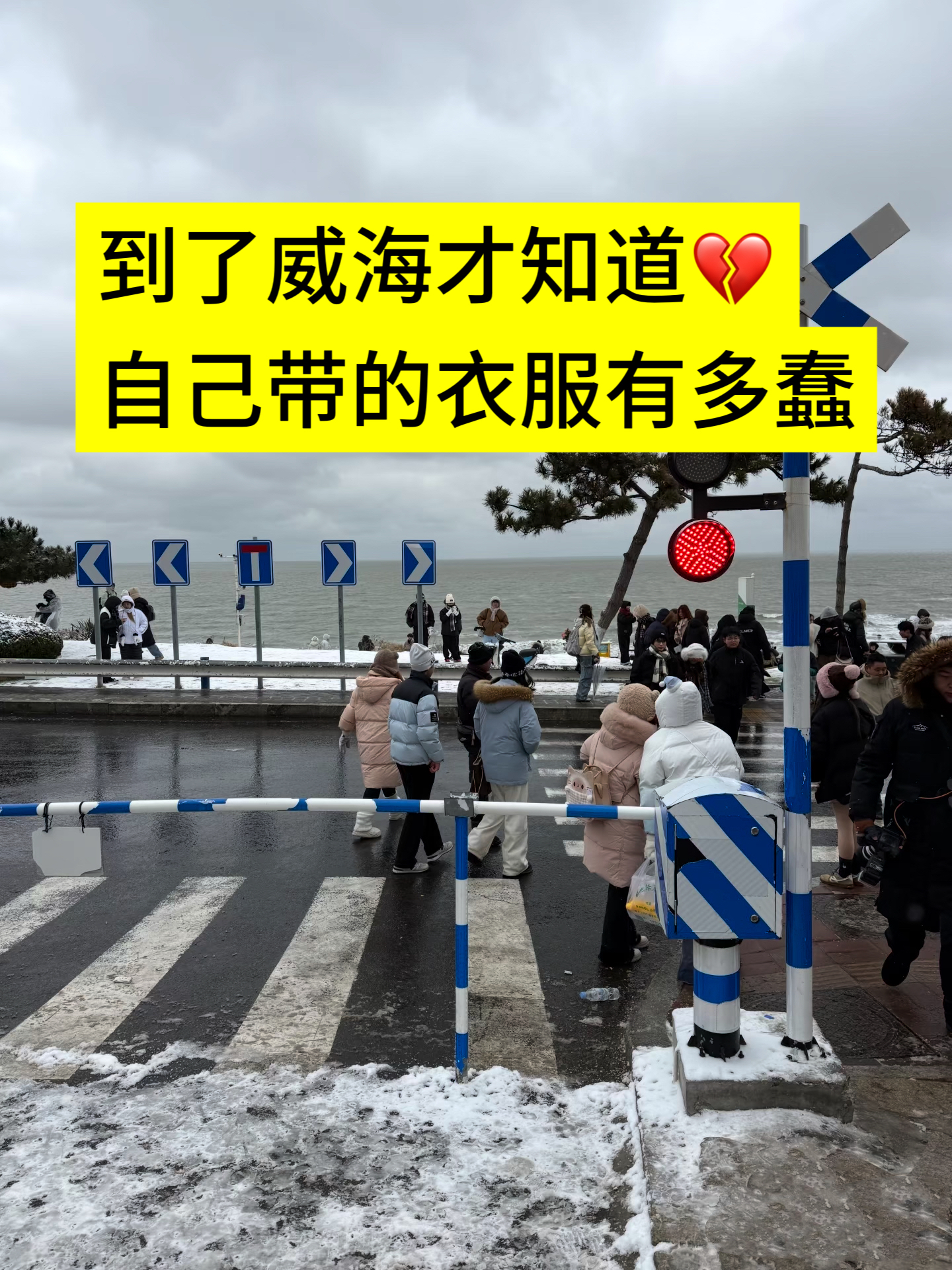 听我一句劝!来威海真的要多带衣物!这边冷到不行❌ 如果在有风,更是冷到崩溃!我第一天出门没穿够,半路又会酒店换了条厚裤子….