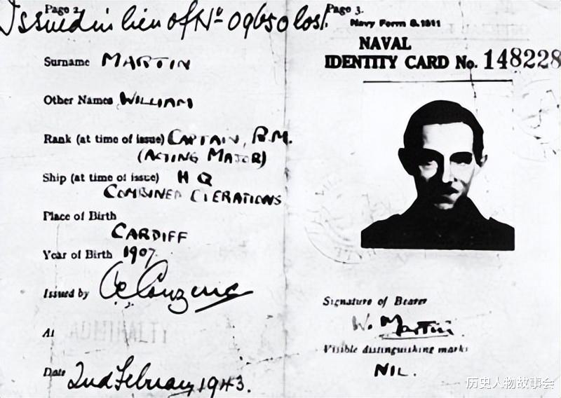 他们给尸体设定的身份是:英国皇家海军陆战队少校威廉·马丁,1907年出生,军官证编号148228。马丁这个姓在英国是一个非常普通的,英国海军中就有不少叫马丁的少校,英国人自己排查起来都费劲,如果纳粹间谍调查将会更困难。