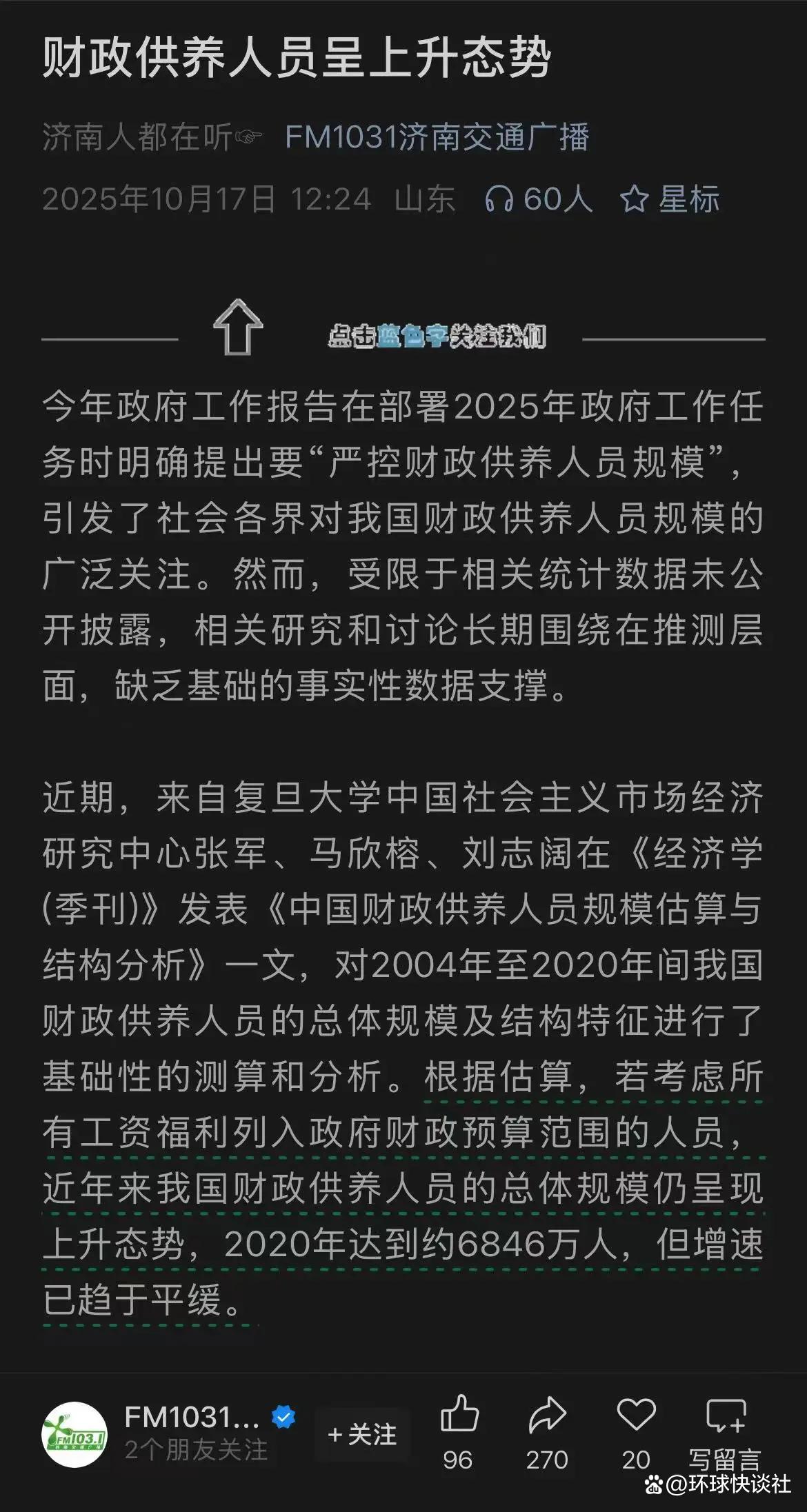 2023年10月17日,第一财经发布《财政供养人员呈上升态势》专题报道引发社会广泛讨论。该报道援引复旦大学中国社会主义市场经济研究中心张军、马欣榕、刘志阔团队在《经济学(季刊)》发表的《中国财政供养人员规模估算与结构分析》研究成果,揭示了2004年至2020年间我国财政供养人员规模从约5000万人增长至6846万人的演变轨迹。研究团队特别指出,尽管总量持续增长,但增速已从2010年前的年均5%降至2020年的不足2%,呈现明显的"增速换挡"特征。