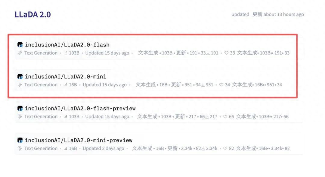 前段时间,我们在 HuggingFace 页面发现了两个新模型:LLaDA2.0-mini 和 LLaDA2.0-flash。它们来自蚂蚁集团与人大、浙大、西湖大学组成的联合团队,都采用了 MoE 架构。前者总参数量为 16B,后者总参数量则高达 100B—— 在「扩散语言模型」这个领域,这是从未见过的规模。