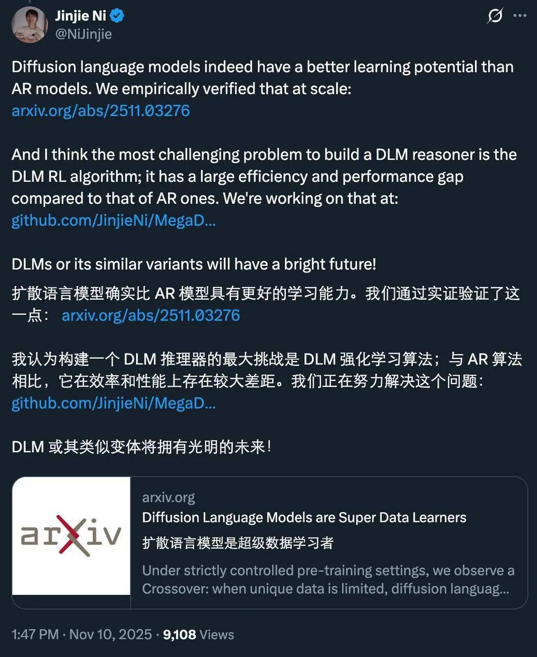 万万没想到,年初还是个小众方向的「扩散语言模型(dLLM)」,现在已经被扩展到千亿参数的规模了。