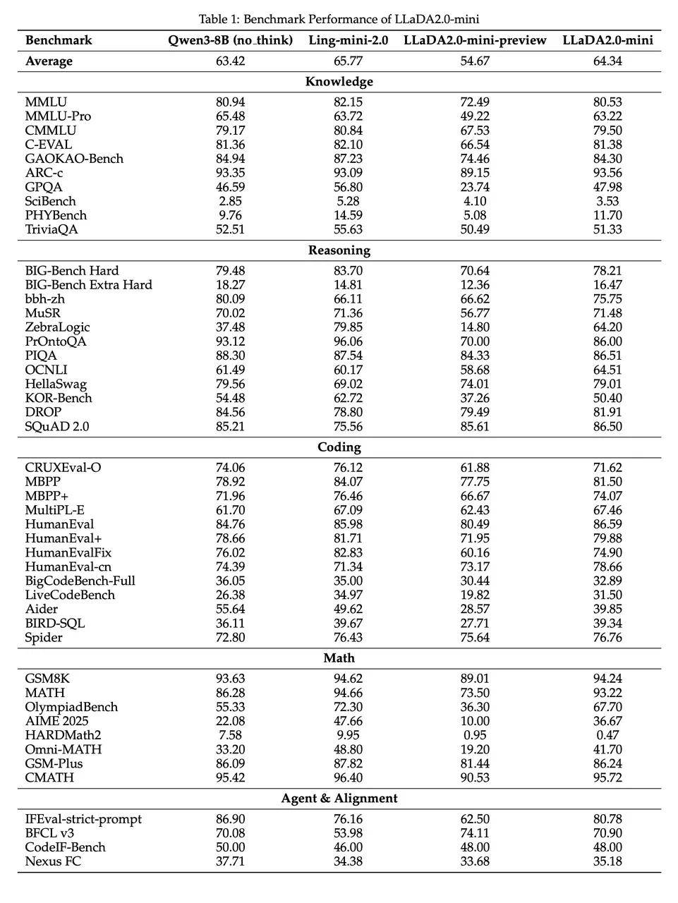 LLaDA 2.0 的性能表明,扩散语言模型是一条可扩展且有竞争力的技术路线。它在通用基准上快速缩小了与 AR 模型的差距,同时在代码生成、工具使用等复杂任务上展现出超越的潜力。