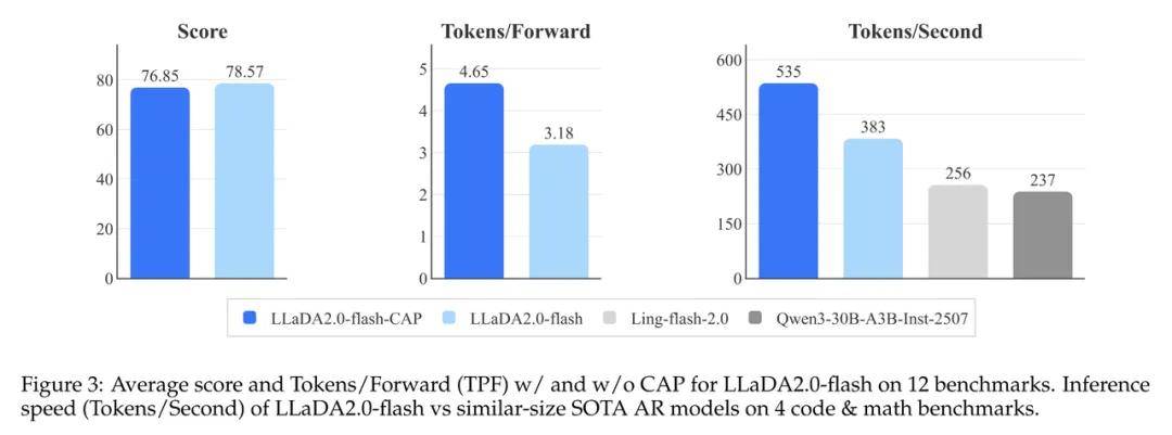 下图 3 的结果显示,在 HumanEval、MBPP、GSM8K、CRUXEval 等基准测试中,LLaDA2.0-flash-CAP 达到了 535 TPS(Token/s),相较于基线 AR 模型(Ling-flash-2.0 与 Qwen3-30B-A3B-Inst-2507)实现最高 2.1 倍推理加速。