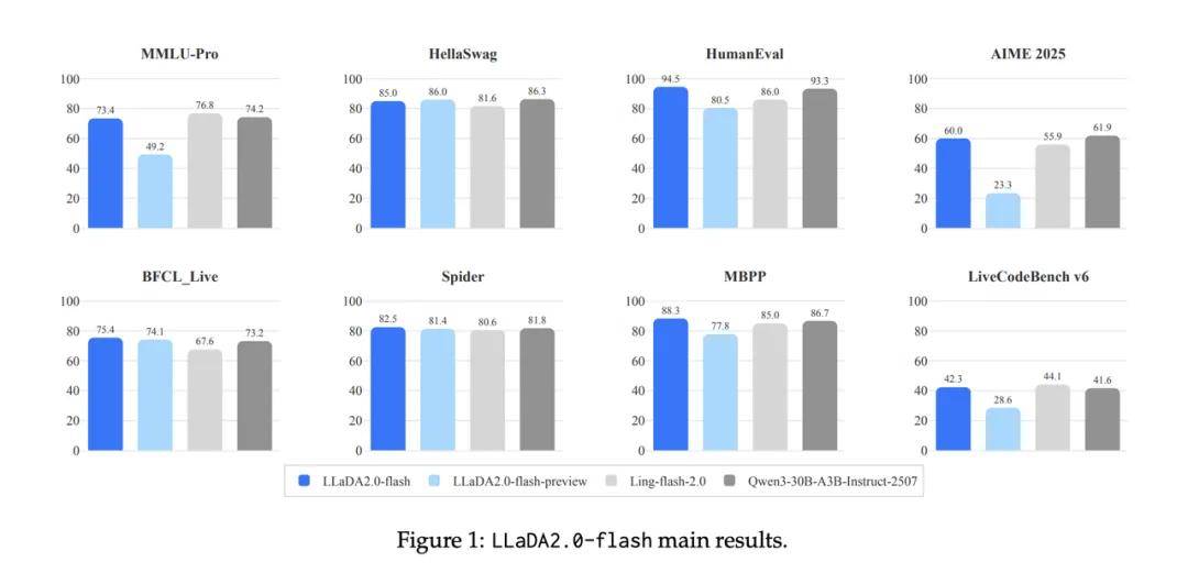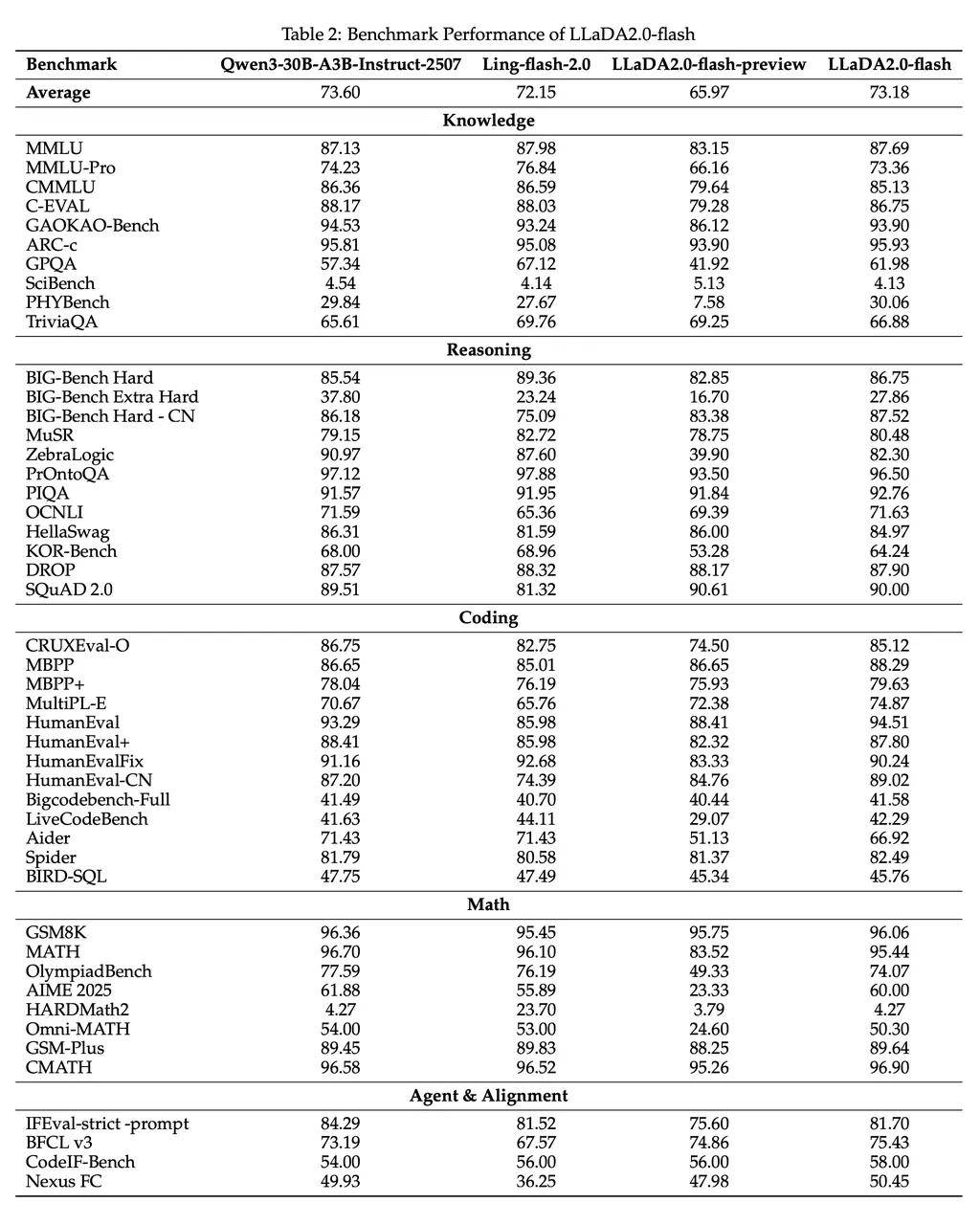 更令人欣慰的是,模型变大了,也确实变强了:在涵盖知识、推理、编码、数学、智能体与对齐几大维度的 47 个基准测试中,LLaDA2.0-flash 平均得分 73.18,与强 AR(自回归)模型 Qwen3-30B-A3B-Instruct-2507(73.60)持平,在编码(如 HumanEval、MBPP)、智能体(BFCL)等复杂任务上优势显著。