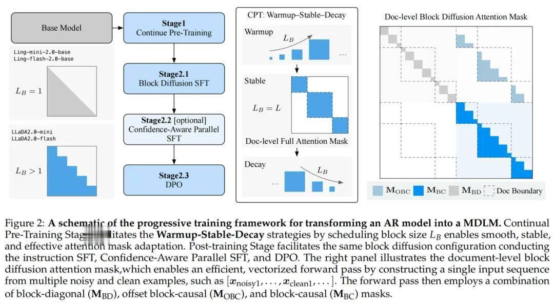 其中在 Warmup(热身)阶段,团队将 Ling-mini-2.0(16B)等 AR 基座模型视为块大小 = 1 的块扩散语言模型(BDLM)起点,并按照「1→4→32 → 64 → 4096」逐步增加块大小。块大小的每次调整在中等规模数据上进行训练,以确保模型平稳过渡。在块大小达到最大 4096 时,BDLM 转化为标准的掩码扩散语言模型(MDLM),完成从因果生成向全局双向去噪的结构性迁移。