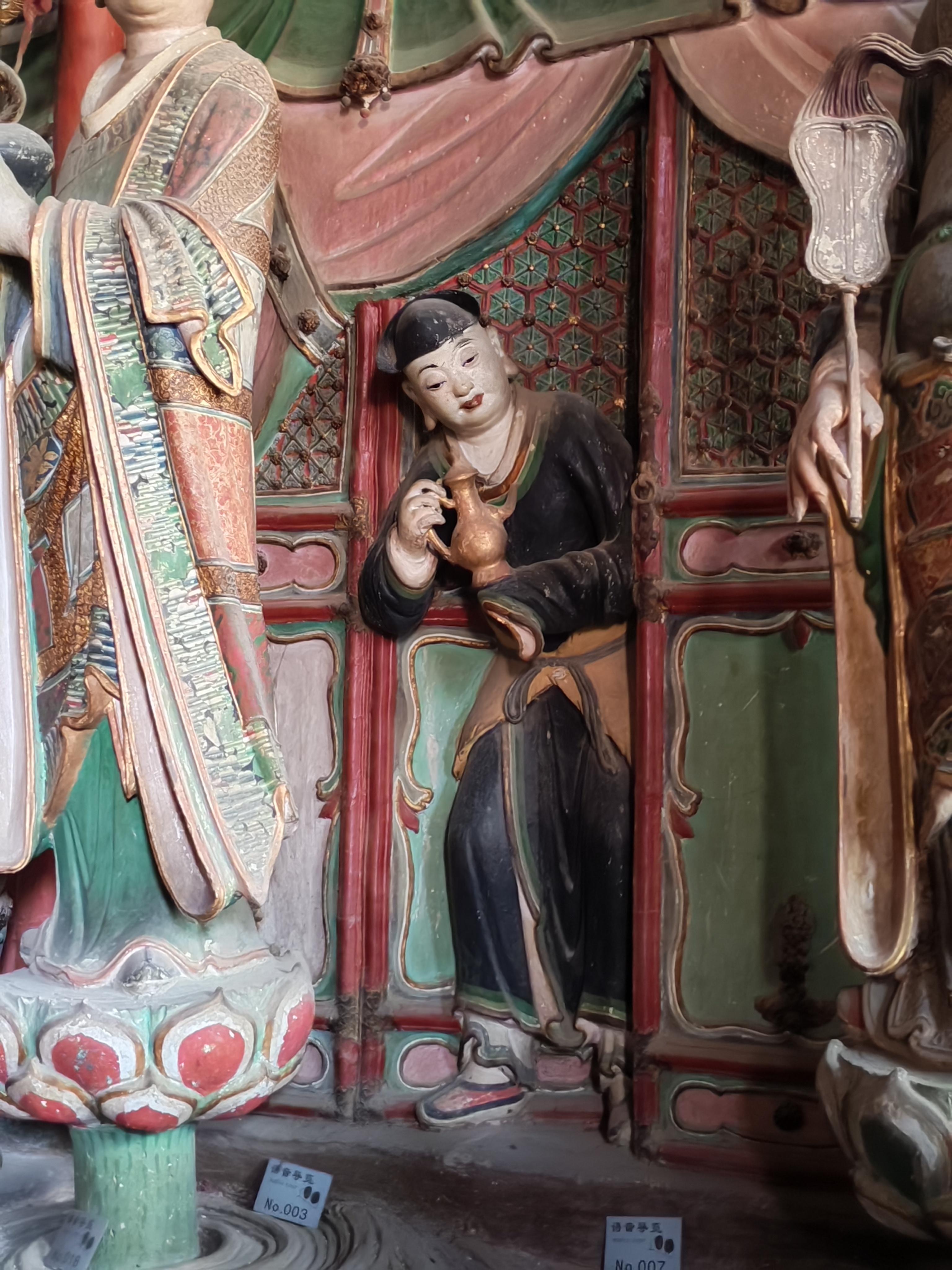 地面以上1米处的“供养人”群塑最接地气:农夫扛锄、妇人抱娃、书生持卷,连他们的补丁、发簪都清晰可辨,是明代晋西民间生活的生动切片。