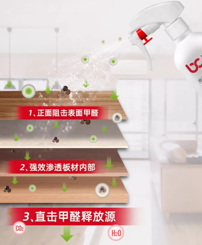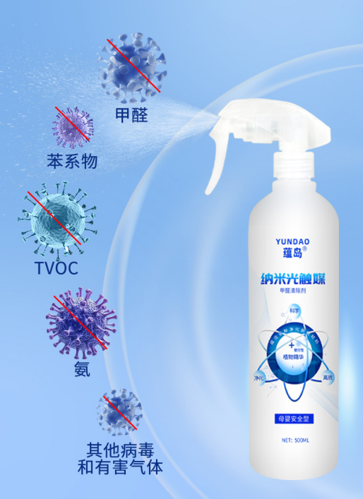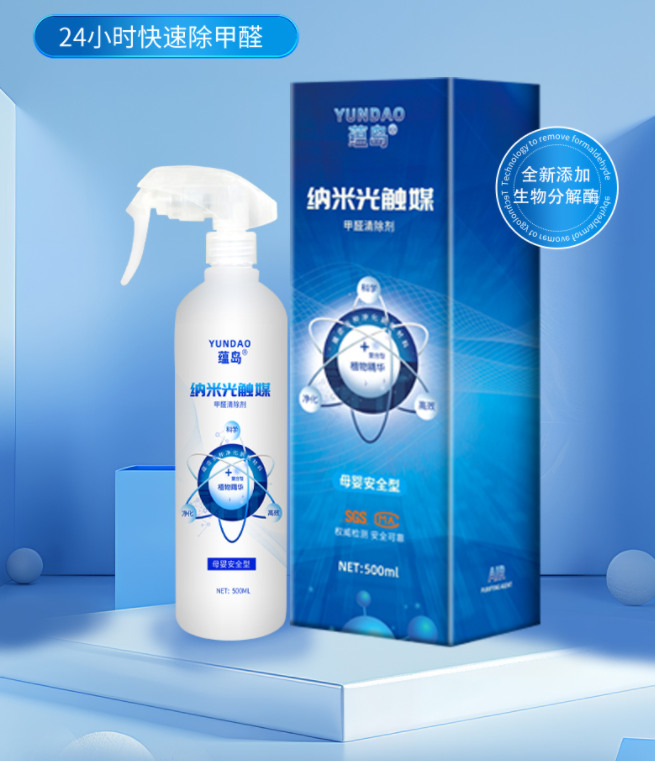 目前甲醛行业中大都用到的除醛喷雾主要成分为光触媒,通过光催化作用和甲醛反应生成水和二氧化碳,从而达到治理效果的甲醛。但这种光触媒喷雾对环境要求较为苛刻,必须在自然光照或者紫外线照射下才能反应。