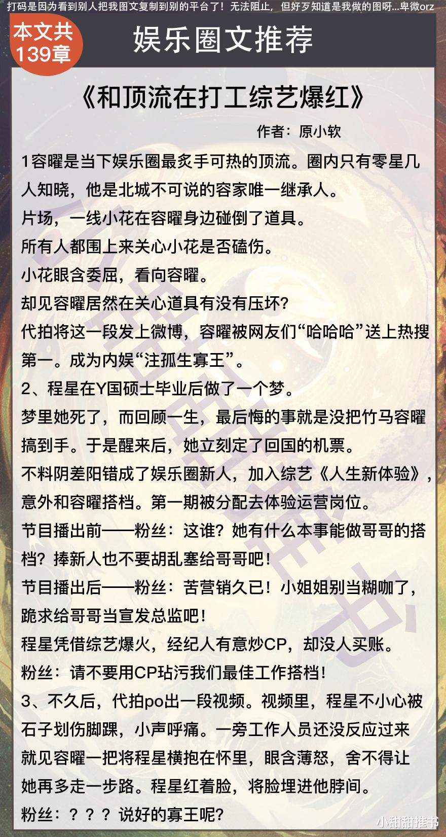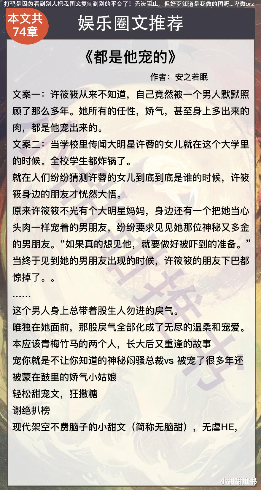 大家好,这期给大家推荐的是7本娱乐圈文小说,无脑甜文!第一本《都是他宠的》作者:安之若眠第二本《和顶流在打工综艺爆红》作