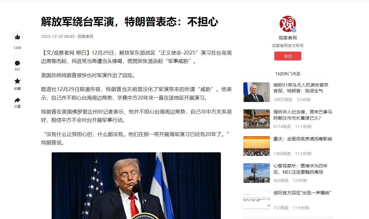 解放军演习已经明确摆出“来真的”的态势,华盛顿却像在看一场与自己无关的戏。特朗普的逻辑很简单:只要钱进账,只要军火卖出去,局势紧不紧张并不重要。
