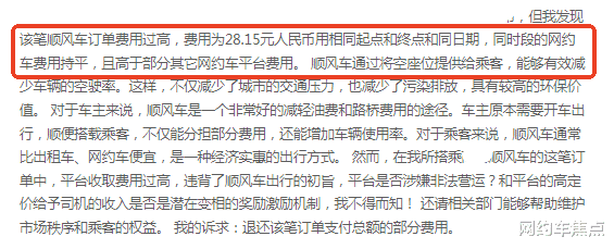 乘客这边,抱怨的声音越来越多。有人在厦门打了一趟顺风车,28元的车费和同一时段同一路段的网约车价钱持平,气得投诉到黑猫平台。