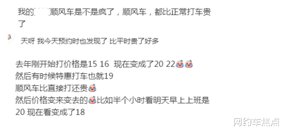 而这还不是特例,有乘客在社交平台上发帖表示现在的顺风车价格越来越贵,打顺风车的价格居然和网约车差不多,甚至比网约车还贵