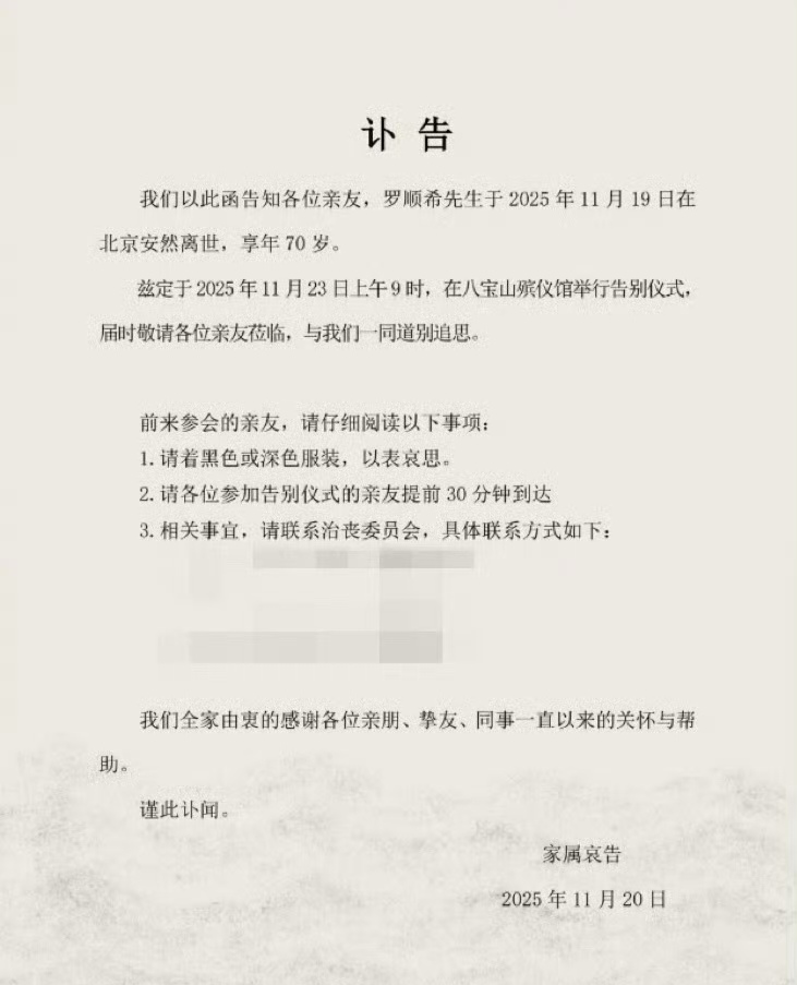 据讣告,罗顺希先生的告别仪式已定于11月23日上午9时在北京八宝山殡仪馆举行。治丧委员会特别恳请前来吊唁的亲友身着深色服装,并提前30分钟到达。