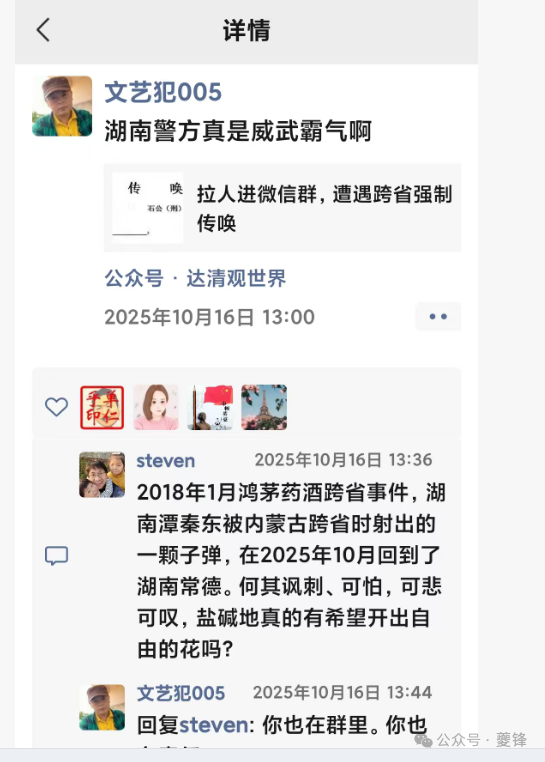 这起事件的荒诞性与争议性,集中体现在行为定性与程序上。根据当事人朱海燕的陈述及公开信息,2025 年 9 月 28 日,八名来自石门县的警员(三名着警服、五名便衣)跨越 1000 公里抵达南宁,向其送达《传唤证》,理由是“因你涉嫌侮辱的行为”。而所谓 “违法事实”,仅仅是她此前在一个微信群中拉了一名网友入群,该网友后续又拉入第三人,第三人在群内转发了一篇涉及石门县纪委副书记吴昌军的文章。舆情沸腾背后:公众对权力边界的深层焦虑事件之所以引发全国网民的广泛关注与强烈担忧,核心在于其触碰了法治社会的敏感神经——公权力与公民权的边界问题。“法治环境下,公权力须保持谦抑和包容,涉及公民人身自由与言论自由时,强制措施须以充分法律依据和事实证据为前提。”。而石门县警方的此次行动,却呈现出公权力扩张的危险倾向:一个普通公民的日常社交行为,竟能引来千里之外的警方介入;一份模糊不清的“涉嫌侮辱” 指控,就能成为限制公民人身自由的理由。这种不确定性,让公众产生了强烈的安全感危机。更值得警惕的是,当事人朱海燕此前曾举报过当地官员,此次传唤是否存在“打击报复” 的嫌疑,成为舆论热议的焦点。权威通报是平息舆情、守护法治的唯一路径面对沸沸扬扬的舆情,石门县相关部门的沉默不语,不仅不能平息争议,反而会加剧公众的猜疑,还会损害政府与司法机关的公信力。在信息传播高度发达的今天,“沉默是金” 早已不适用于舆情应对,唯有主动发声、坦诚回应,才能赢得公众的理解与信任。一份合格的权威通报,至少需回应以下四大核心问题:其一,此次跨省传唤的具体法律依据与审批流程,是否符合《刑事诉讼法》《治安管理处罚法》的相关规定?其二,认定朱海燕“涉嫌侮辱” 的具体事实与证据是什么,如何解释其拉人入群行为就被传唤的荒唐逻辑?其三,动用八名警员跨省执法的决策依据是什么?其四,当事人举报当地官员与此次传唤是否存在关联,是否存在打击报复的情形?这些问题的答案,不仅关乎朱海燕一个人的合法权益,更关乎所有公民对法治的信仰。如果石门县警方的传唤行为合法合规,那么通过通报公开相关依据与事实,能够正视听、明是非,彰显执法的公正性;如果确实存在程序瑕疵或定性不当,那么及时承认问题、纠正错误,更能体现有错必改的担当,重获公众信任。反之,持续的沉默只会让猜疑发酵,让“权力滥用” 的标签愈发不可辩驳,最终损害的是整个地方治理的法治根基。网络空间不是法外之地,公权力行使更应在法治框架内运行。“因拉人进微信群被跨省传唤”的荒诞事件,已经超出了普通个案的范畴,成为检验地方治理能力与法治水平的试金石。我们期待湖南省石门县相关部门能够正视舆情关切,尽快发布权威通报,以事实澄清疑虑,以法律明确边界,让公众看到一个负责任、守法治的政府形象。这不仅是平息此次舆情的必然要求,更是守护法治尊严、维护社会公平正义的应有之义。