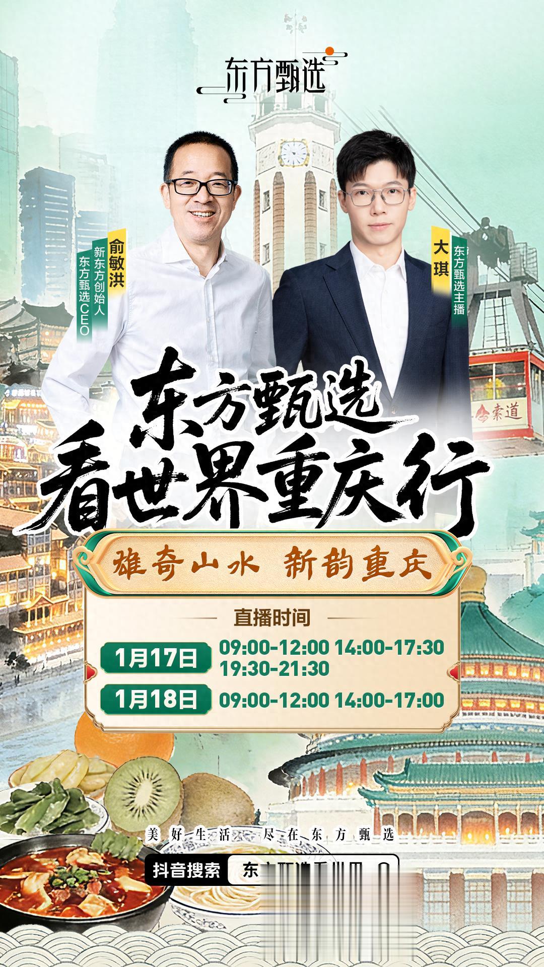 1月17日至18日,应重庆市商务委员会邀请,俞敏洪将与东方甄选人气主播大琪一同走进山城重庆,开启“看世界重庆行”直播活动。此次行程将以“两江四岸”为主线,通过东方甄选App、抖音“东方甄选看世界”双平台同步直播,带领网友云端漫游江城胜景的同时,更聚焦于重庆本地的特色风物与消费体验,带来一场充满烟火气息与地道滋味的线上之旅。