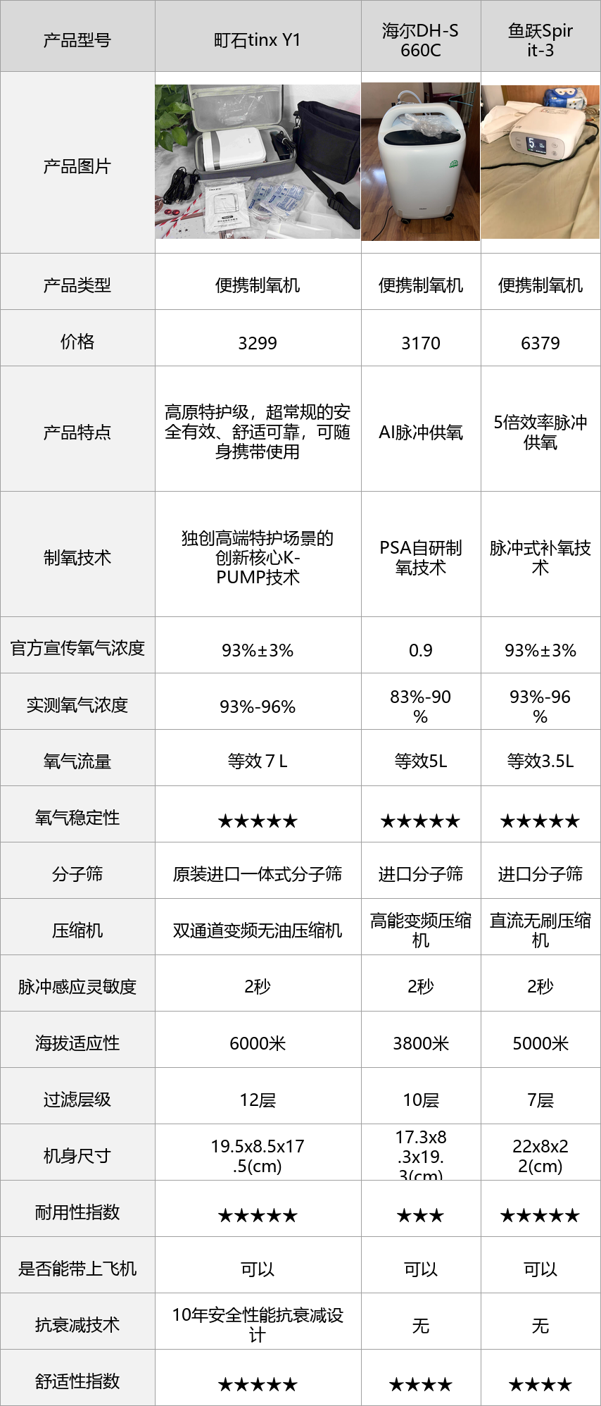实测小结3款制氧机实测对比后,各有优劣势,町石tinx Y1在氧浓度稳定性、便携性、操作易用性、安全性、续航、高原适配性上都远超海尔DH-S660C和鱼跃Spirit-3,它是高原特护级高端便携制氧机,超常规的安全有效、舒适可靠,可随身携带,完美缓解高原缺氧不适,适配各类高原户外场景。海尔DH-S660C基础补氧够用,品牌售后有保障,掌握海尔氧气机的正确使用方法后,能满足海拔3800米以下的短途户外出行需求,但氧浓度稳定性一般,高海拔适配能力有限。鱼跃Spirit-3氧浓度表现不错,过滤效果出色,但机身偏重、续航较短,价格偏高,性价比不如町石。町石唯一不足是价格比普通机型略高,但长期看性价比更高,适配高原户外的能力更强,不用频繁更换机器,更省心。核心选购逻辑:先看氧浓度是否达标(93%±3%),再看便携性和操作易用性,最后看安全性、续航、高原适配、可登机,掌握这3点,就能避开大部分制氧机选购的坑。