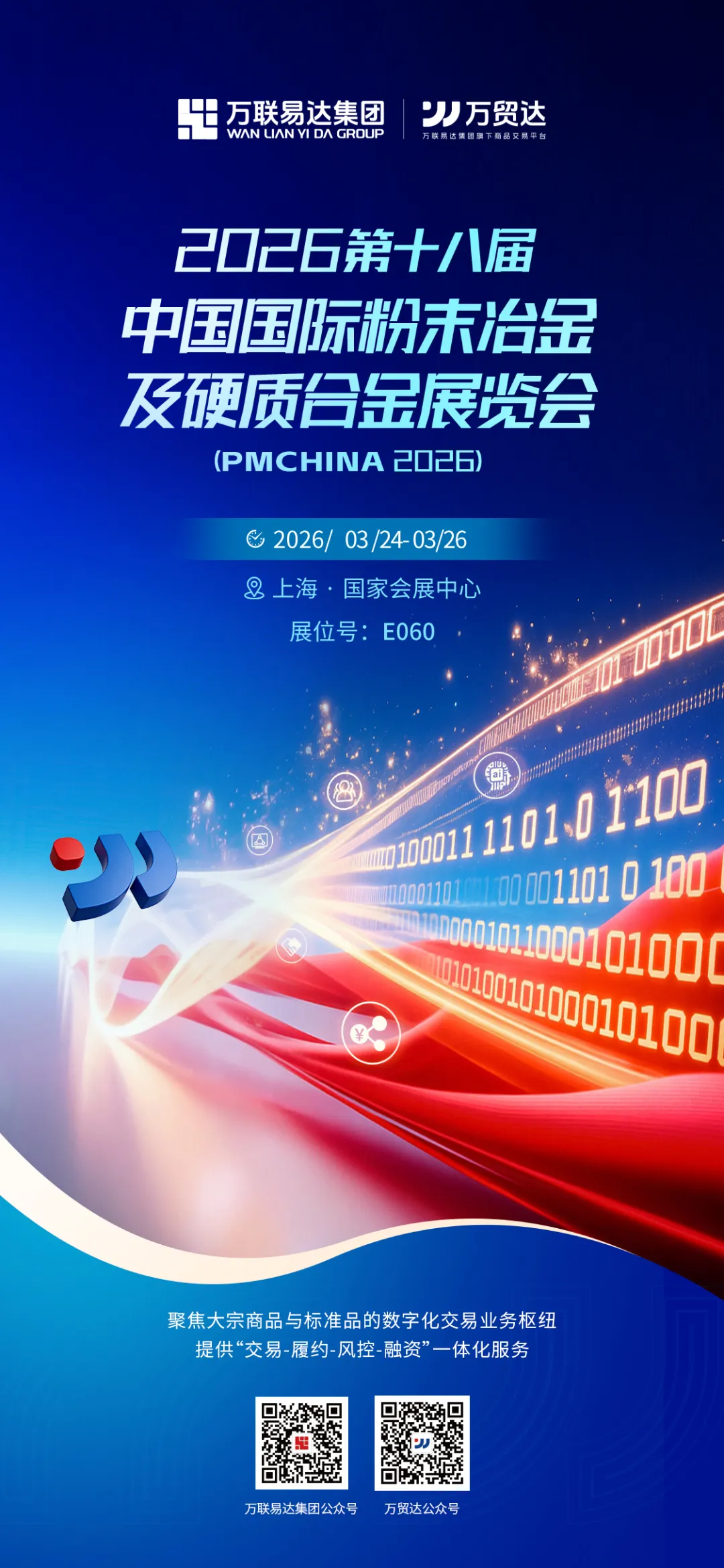 3月24日-26日,2026第18届中国国际粉末冶金及硬质合金展览会(PM CHINA 2026)将在国家会展中心(上海)隆重举行。万联易达集团旗下商品交易平台——万贸达首次重磅亮相,与千余家中外知名企业同台交流,重新定义粉末冶金行业的数字化交易模式!
