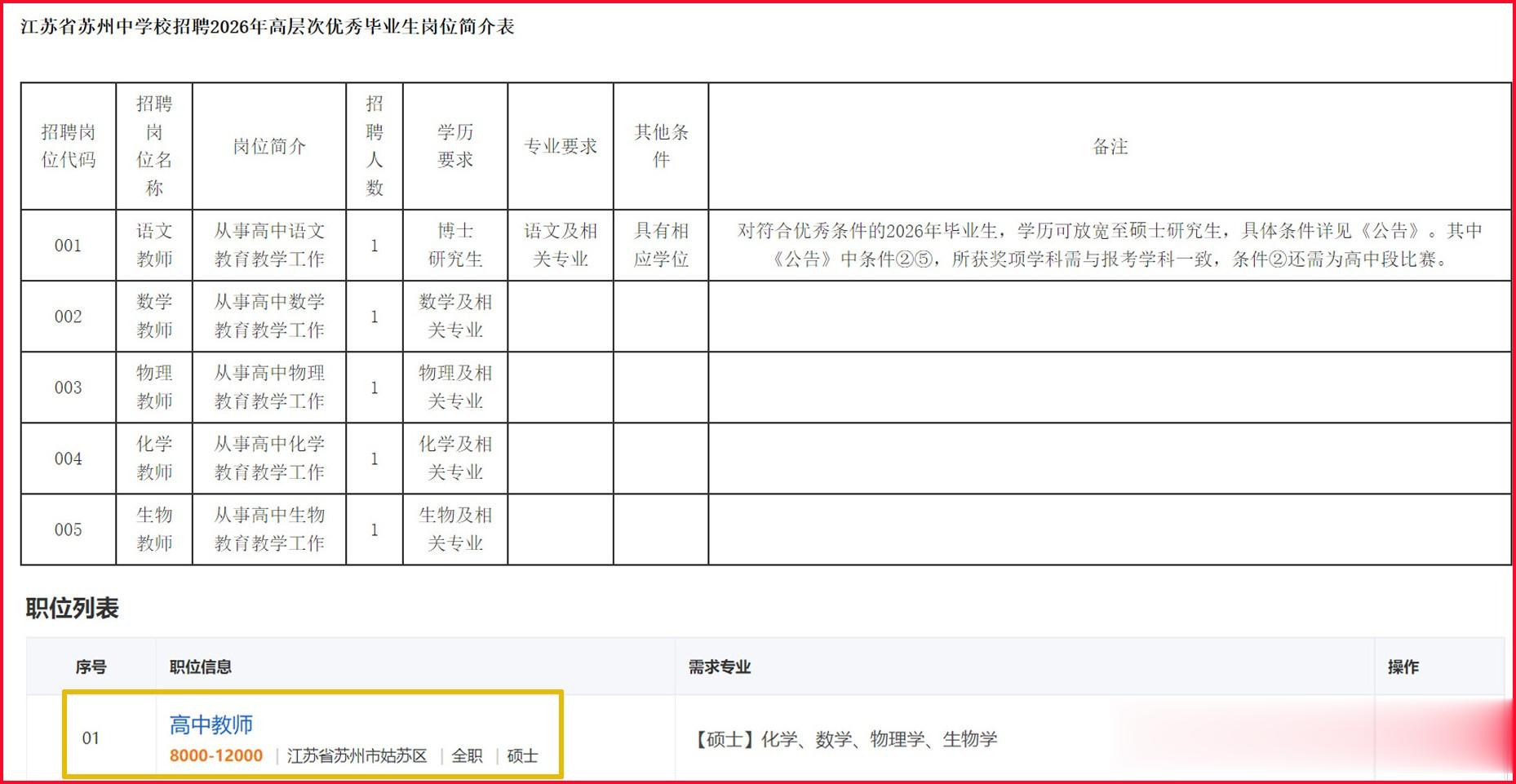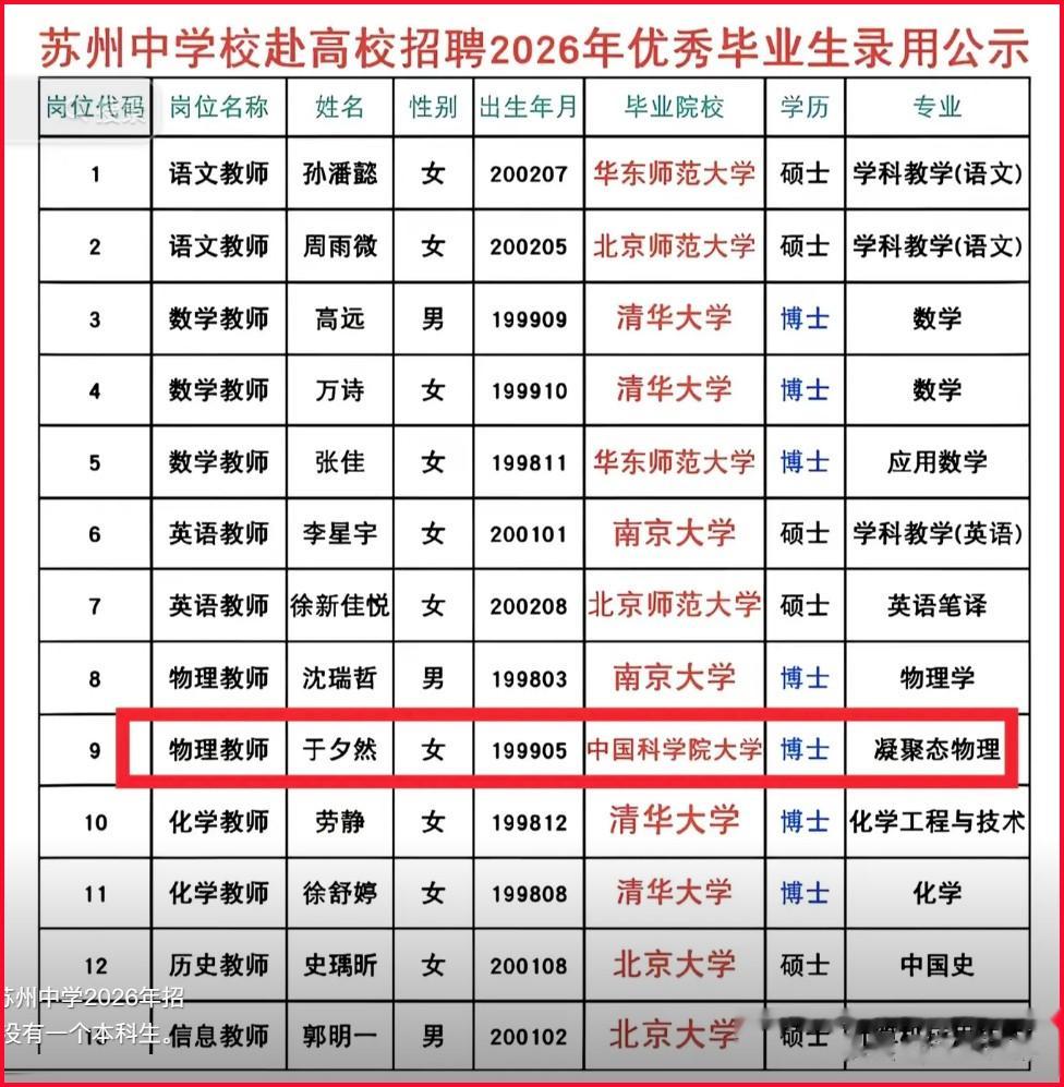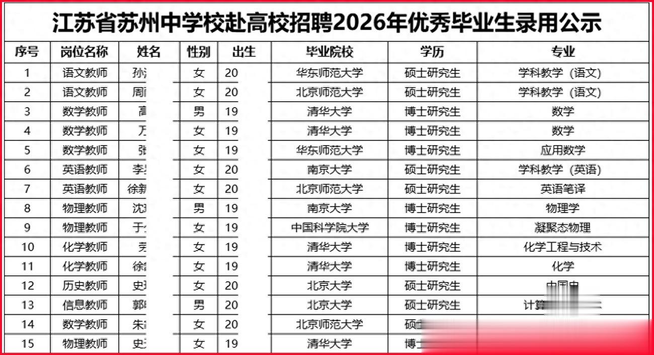 苏州中学是江苏省赫赫有名的重点中学,大学生想进这所学校有多难?苏州中学公布了赴高校招聘2026年优秀毕业生录用公示,上榜名单令人咋舌。名单上的15人没有一个本科生,博士生占了一半。清华北大毕业的有5个,占了三分之一。