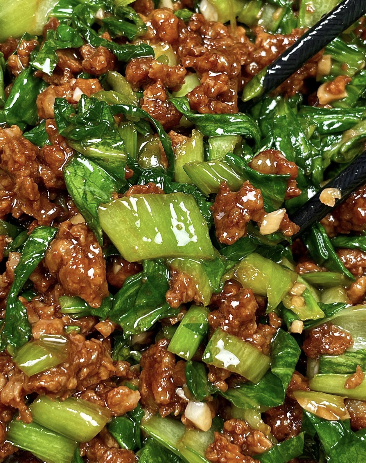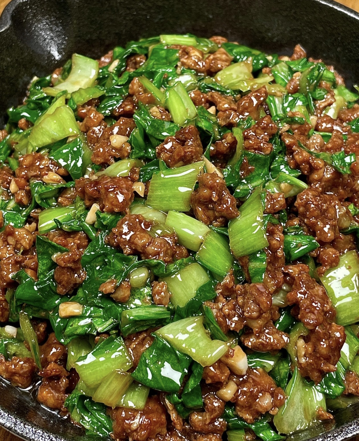 然后把炒好的肉末倒回锅里,和青菜一起翻炒均匀,加一勺生抽提鲜,一勺蚝油增香,不用额外放盐,酱料的咸度已经足够。大火翻炒1分钟,让每一根青菜都裹上酱汁,看到汤汁微微浓稠就可以关火出锅。