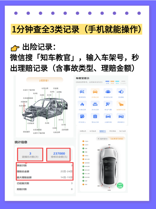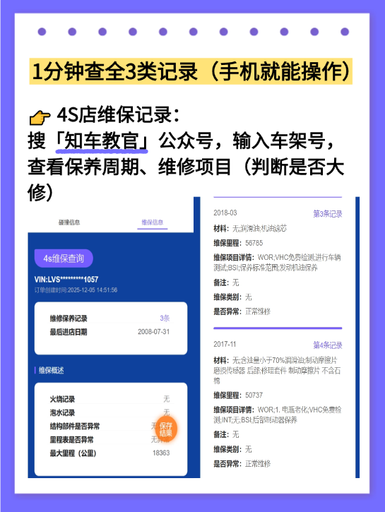 在这里提醒大家,只查里程还不够!车贩子除了调表,还会刻意隐瞒车辆的维修、出险记录,把大修车、事故车伪装成“精品车”,哪怕签了保实表合同,也未必能避开这些坑。而【知车教官】不止有里程记录查询,还有另外两个“避坑神器”,搭配使用,能全方位摸清车辆真实车况,彻底杜绝踩坑。
