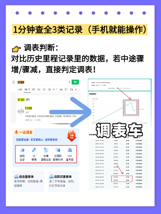 车贩子敢签保实表合同,靠的不是底气,而是信息差;他们敢调表,赌的不是运气,而是你不会查。只要我们掌握这简单三步,用好【知车教官】的三个查询功能,就能打破这种信息差,让车贩子的套路无处遁形。