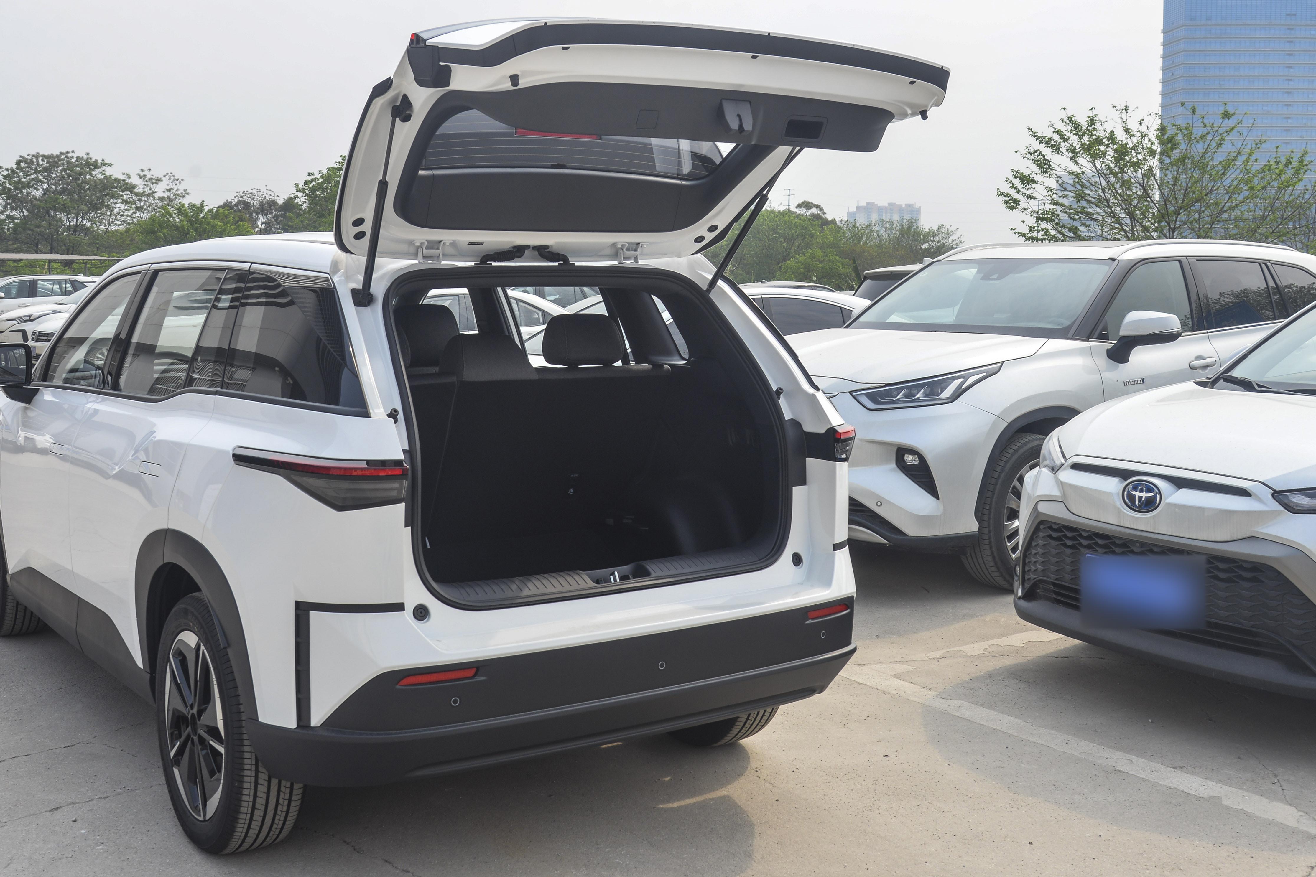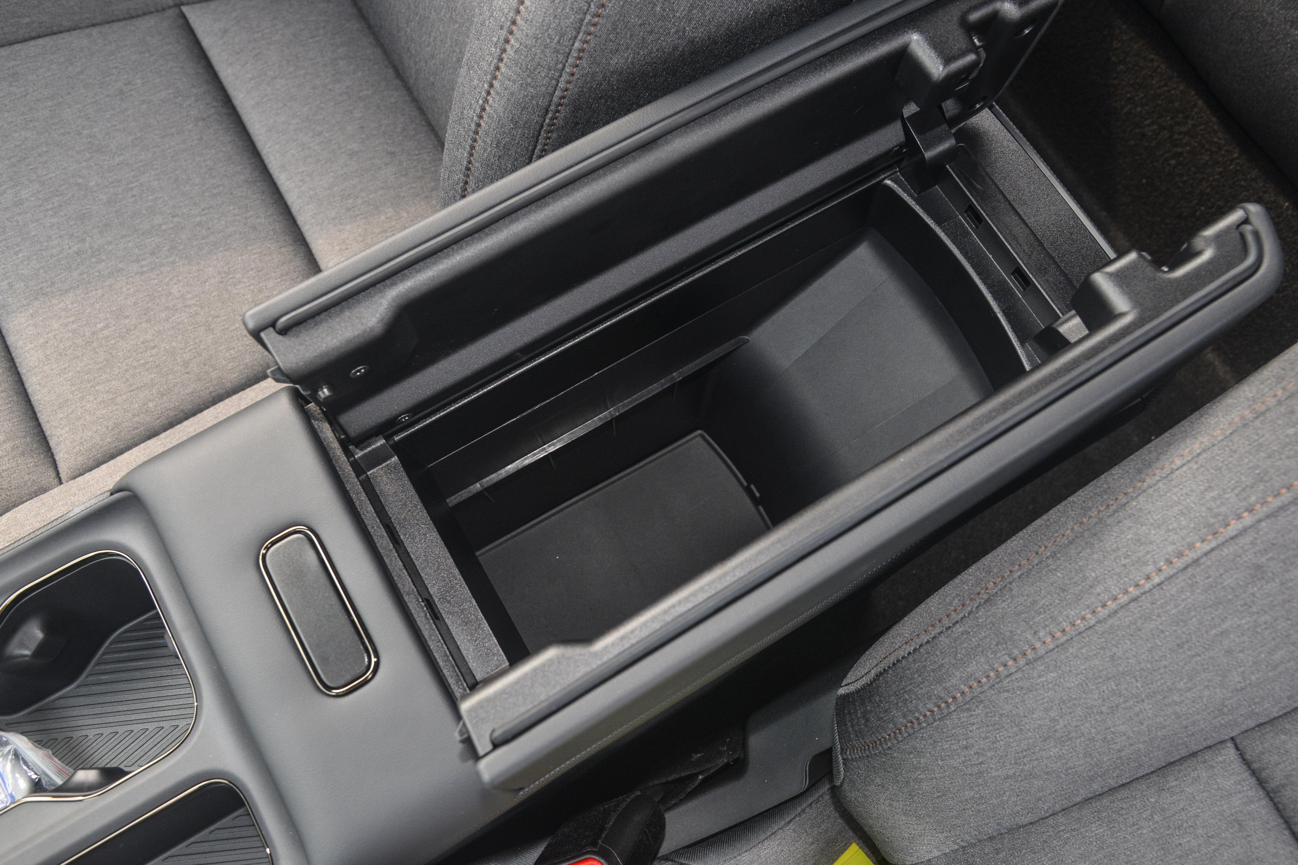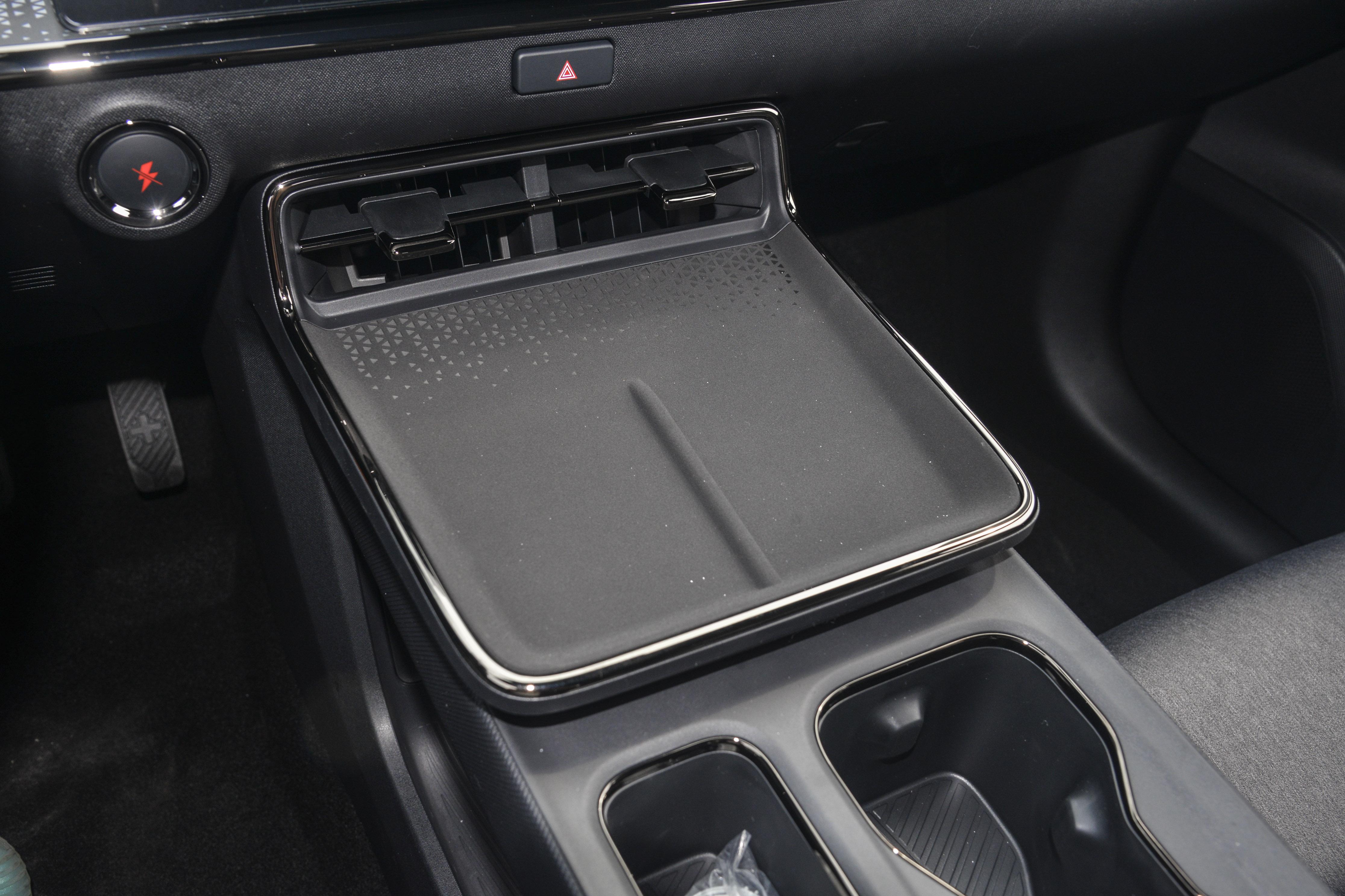 储物空间方面,全车共有30处收纳位置,设计较为实用。方向盘左侧可放置驾驶证、高速卡等小物件;中央扶手箱容积较大,能容纳两瓶矿泉水和一个充电宝;后排配备了专门的杯架和小桌板,方便后排乘客放置物品或孩子使用。无线充电板配备了散热风扇,可避免夏季充电时手机发烫。后备箱常规容积为427L,实测可放置3-4个登机箱,地板下方还设有隐藏储物格,用于存放不常用的零碎物品。将后排座椅全部放倒后,能形成几乎全平的大空间,便于装载露营装备、婴儿车等大件物品,相比同级别中的元PLUS、零跑B10等车型,装载能力更有优势。