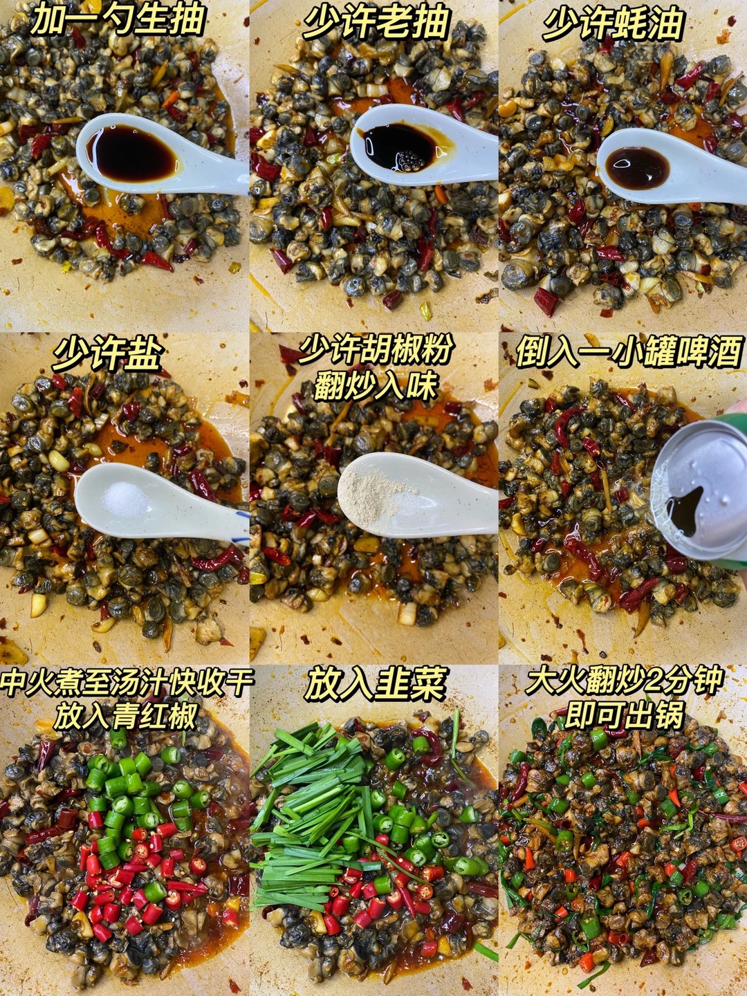 3️⃣锅中倒入适量油,油热下入葱姜蒜和干红辣椒炒香,放入一小块火锅底料炒出红油,倒入螺蛳肉翻炒均匀,加一勺生抽、少许老抽、少许蚝油、少许盐、少许胡椒粉翻炒入味,倒入一小罐啤酒,中火煮至汤汁快收干,放入青红椒和韭菜,大火翻炒2分钟即可。