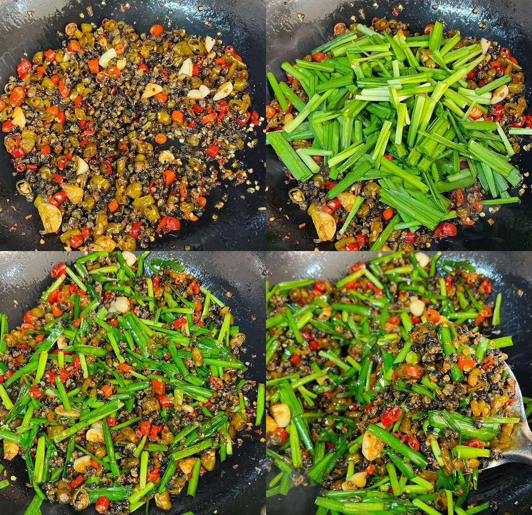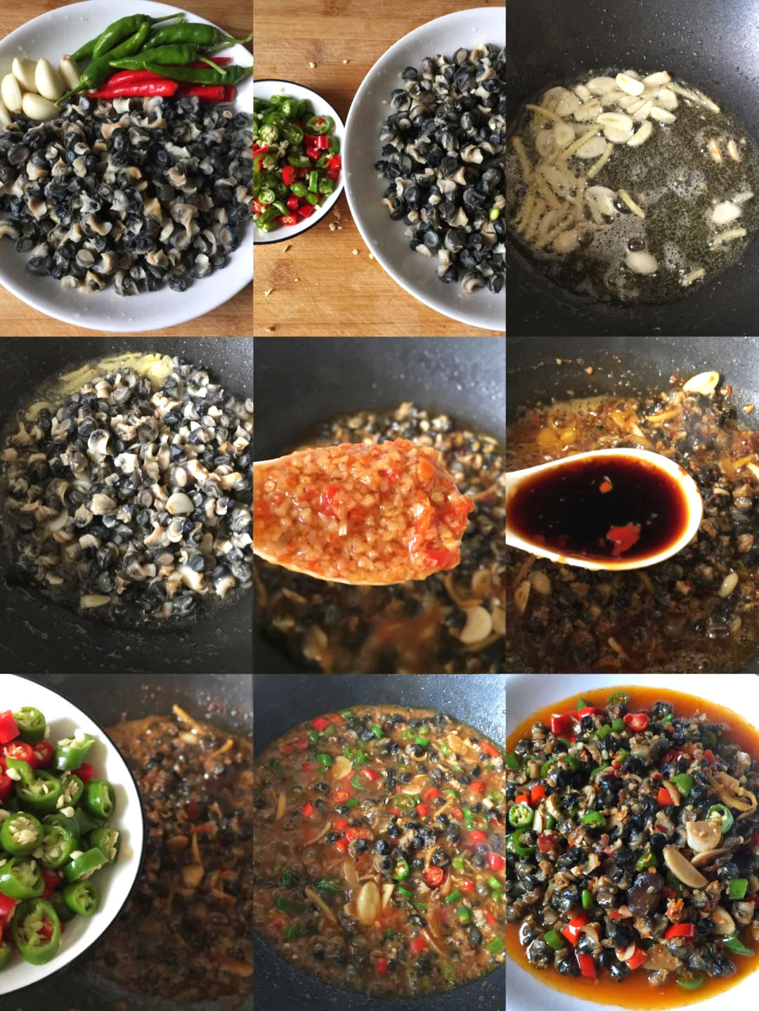 2️⃣油热放田螺肉、盐炒下,放蒜头、姜末炒下,再放米酒、小米辣、酸辣椒、盐炒香;