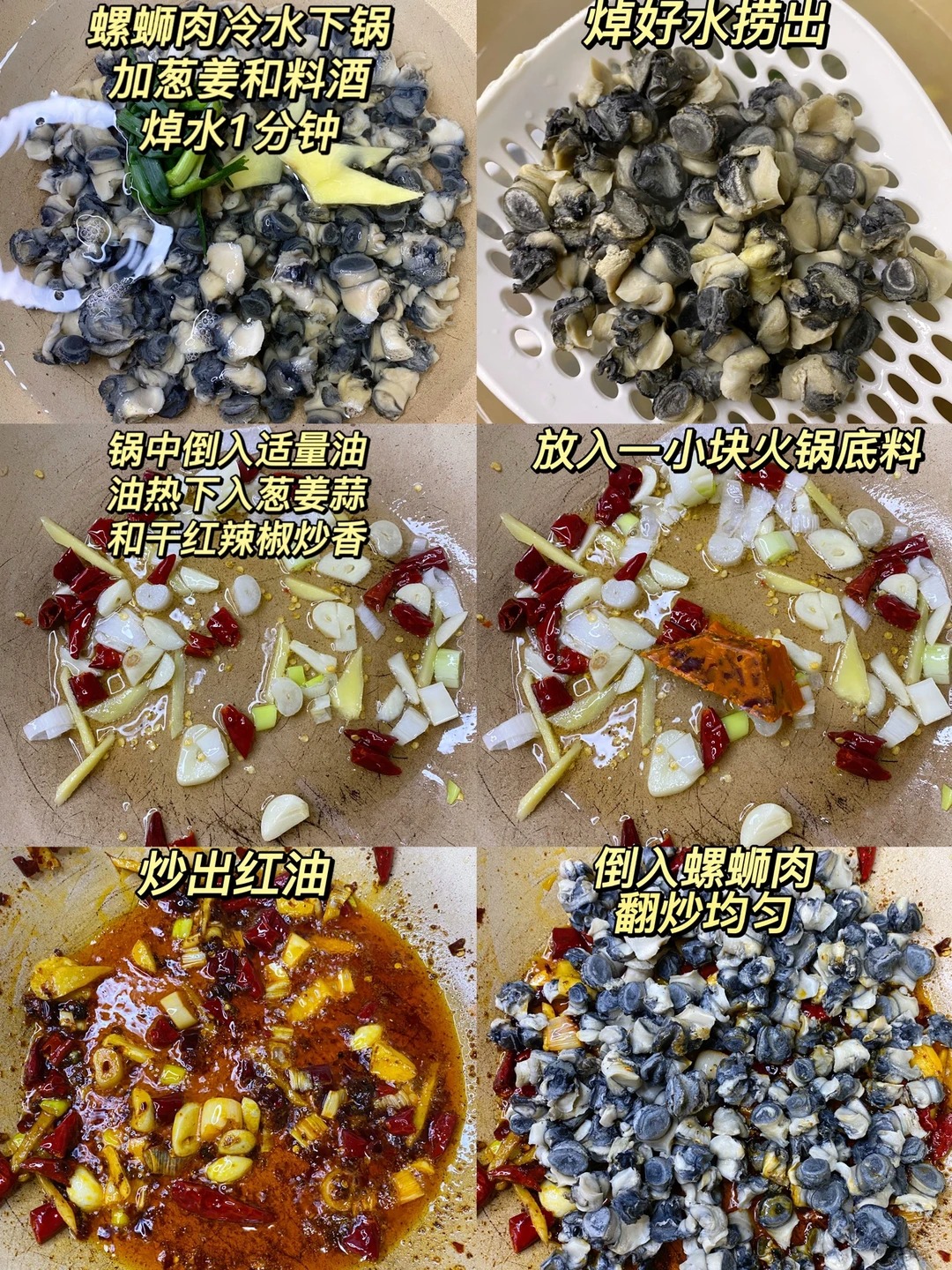 【准备食材】螺蛳肉 | 青红椒 | 干红辣椒 | 葱姜蒜 | 一小块火锅底料