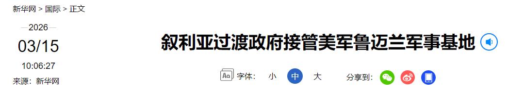据新华社消息,当地时间3月14日,叙利亚过渡政府宣布,正在接管美军位于叙利亚东北部哈塞克省的鲁迈兰军事基地。
