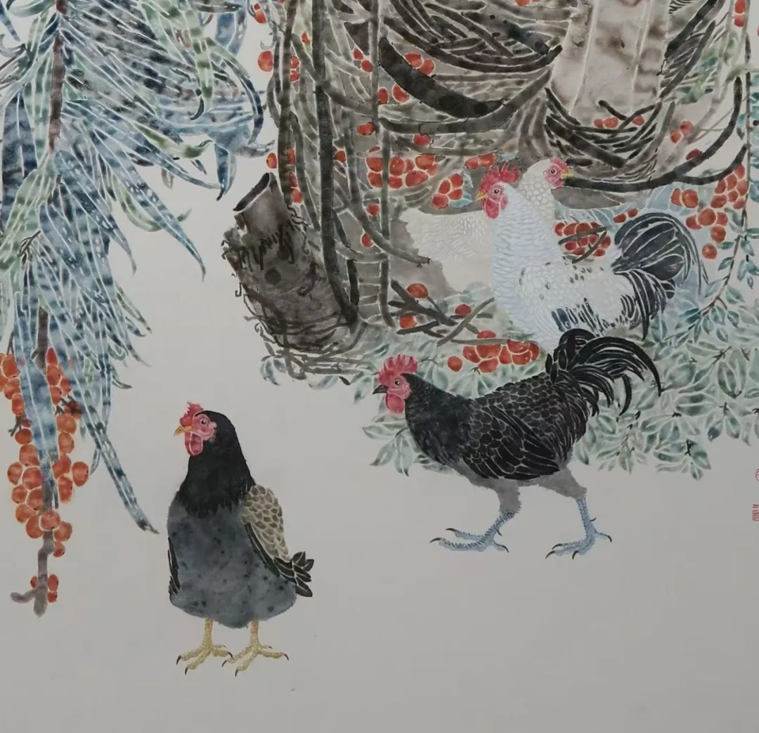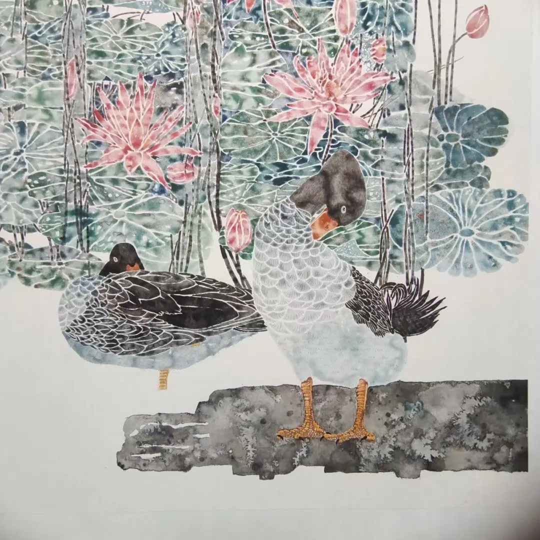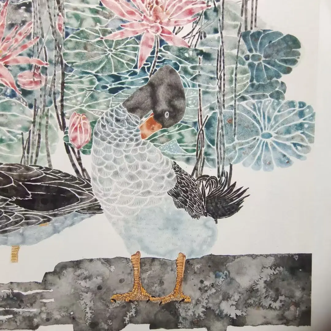 技法上运用撞水、撞粉之法以水调彩、以彩立形,黑白羽禽鸟与枝叶形成递进的层次关系,作品立足传统、面向当代,以南北意象对话承载故土情怀与生活诗意,是对传统没骨花鸟的传承、创新与当代转化并赋予花鸟画全新的时代内涵与生命力。