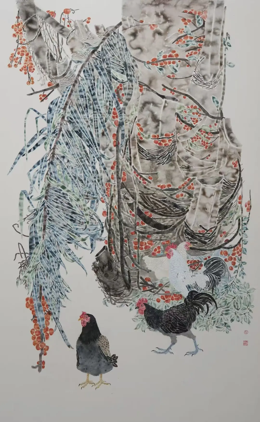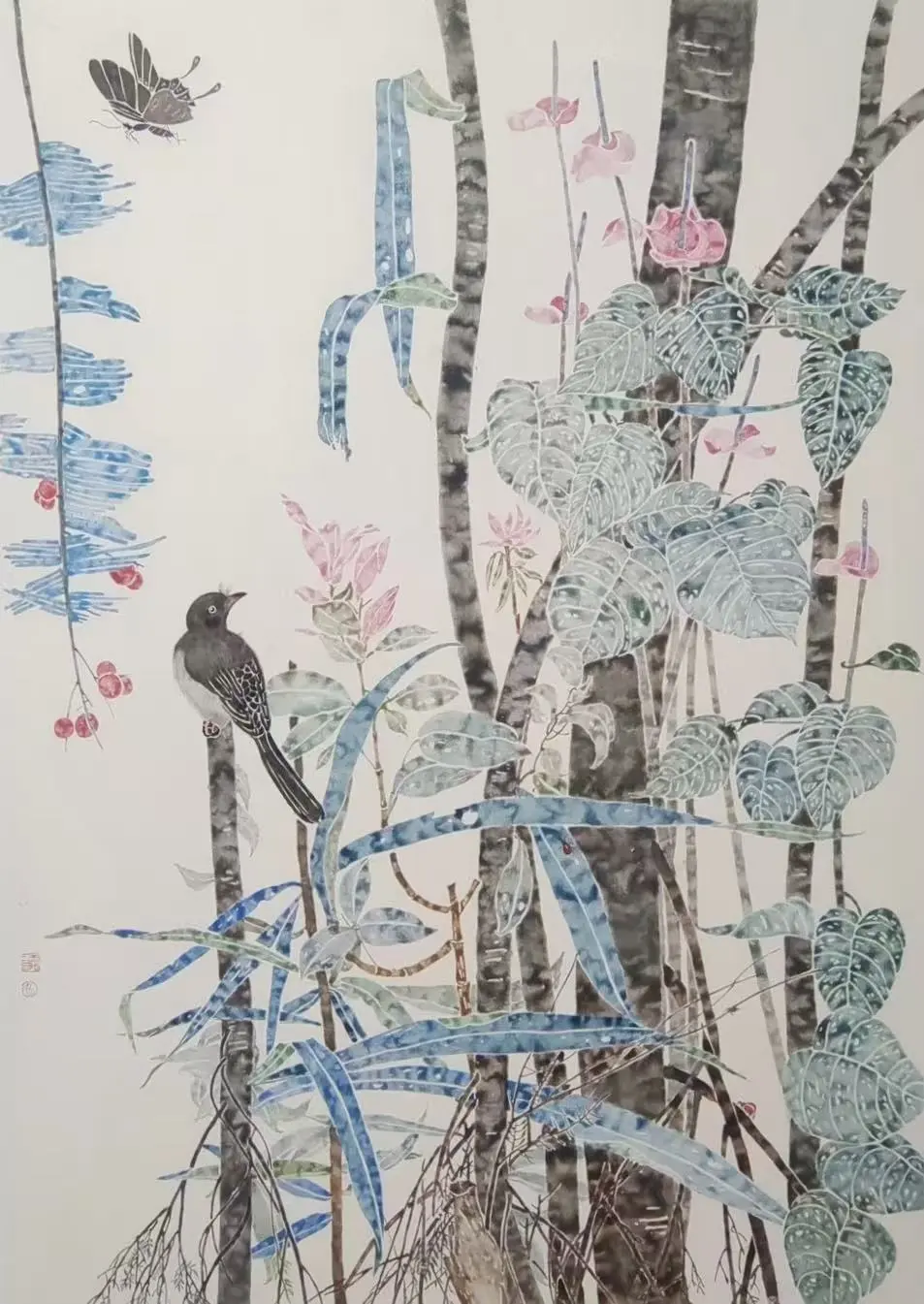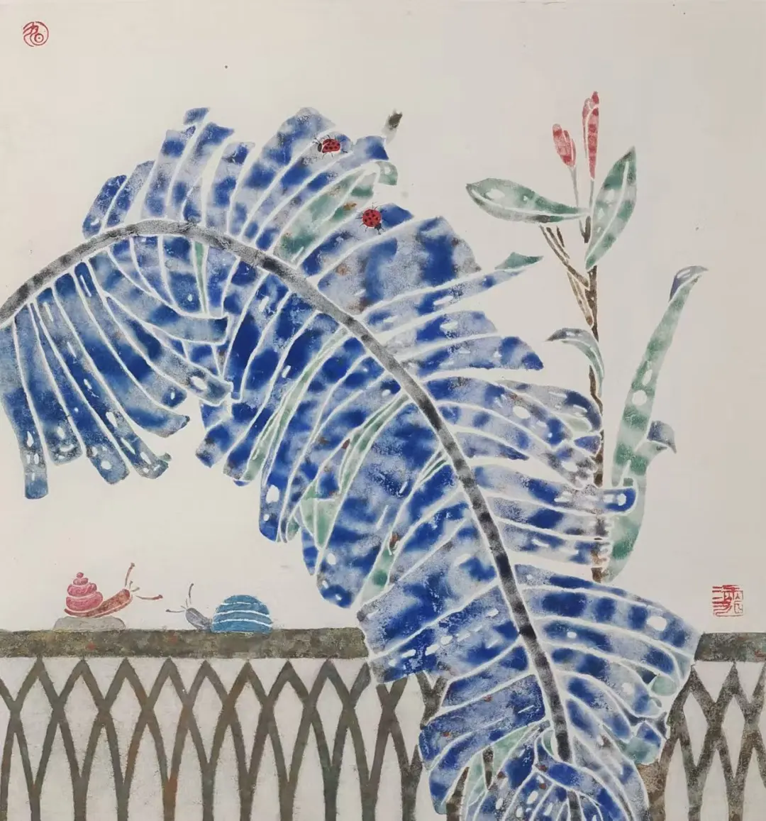 本作以传统没骨花鸟为基底,探索传统笔墨在当代语境下的转化。作品承续“不施墨线、以水色塑形”的技法精髓,以个人生活经验与当代审美重构田园景致,实现传统技法与当代叙事的融合。以北方故土禽鸟为情感依托,融入南方棕榈意象,形成乡土记忆与诗意审美的南北对话,构建独特的当代叙事。画面构图疏密相生于繁茂处留白透气,兼具古典意韵与现代节奏。