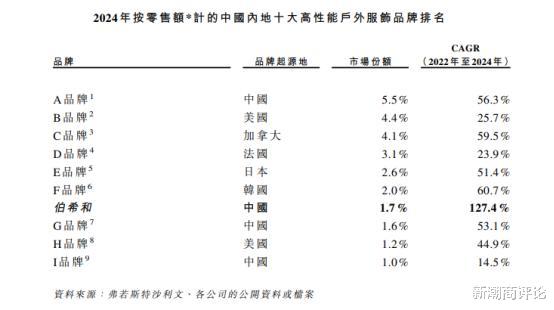 根据弗若斯特沙利文的资料显示,2024年中国内地高性能户外服饰行业零售销售额达到1027亿元。伯希和是中国内地发展最快的高性能户外服饰品牌,按零售额计算,以1.7%的市场份额排在第七位(本土品牌前三)。由于价格亲民,再加上产品功能与设计对标始祖鸟的策略,使其赢得了“始祖鸟平替”的称号。