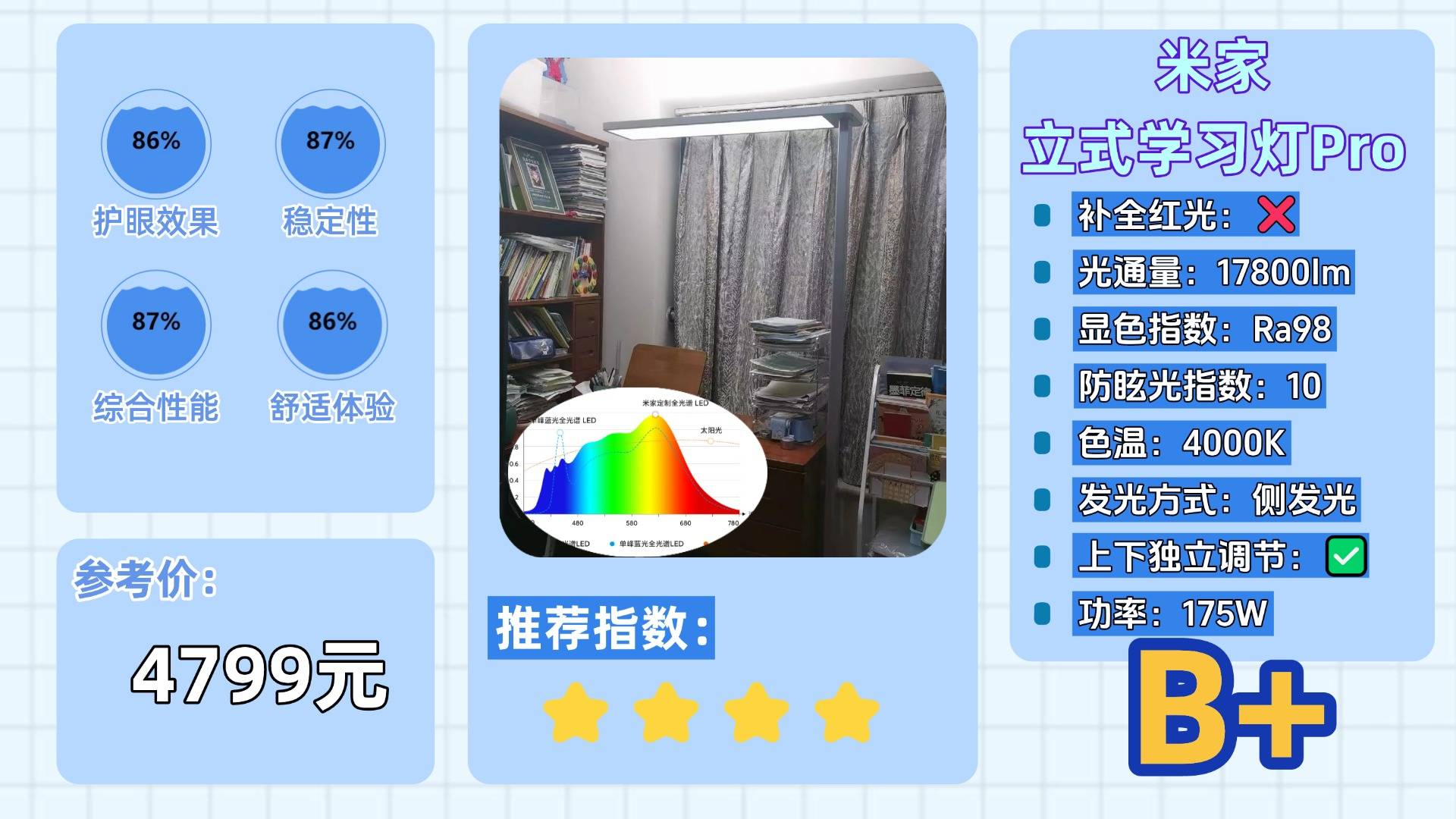 什么牌子的大路灯护眼好用?雷士未来光Pro3采用侧发光设计,搭载156W大功率,总光通量高达13200lm,能均匀覆盖大空间,适合书房、客厅等场景。其显色指数为Ra98.6,色彩还原较好。防眩光指数UGR<10.4,光线柔和度表现较好,不过光通量过高,需注意高亮度下光线过强产生的眩光,建议根据使用距离调节亮度以提升舒适度,智能化方面支持入座感应和环境光自适应调节,自动匹配最佳亮度,操作便捷。灯体采用航空铝材质,搭配15°防倾倒底座,稳固安全。不过,其蓝光激发全光谱技术虽通过RG0认证,但红光增益效果有限,长时间高亮度使用可能增加眼疲劳风险,建议合理控制光照强度。