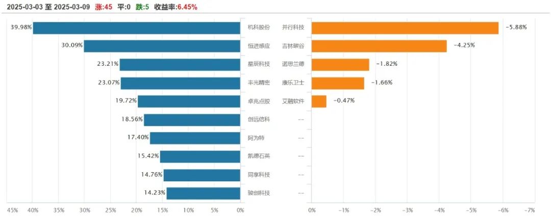 上周(3月3日-3月9日),北证50指数有所回调,周涨幅达6.45%至1391.28点。在50家北证50成分股中,45只上涨,0只平盘,5只下跌。