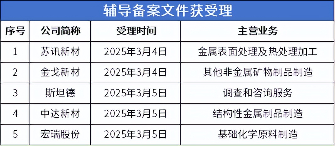 中达新材(874679)公告显示,2025年2月24日,公司向浙江证监局报送了向不特定合格投资者公开发行股票并在北京证券交易所上市辅导备案申请材料,辅导机构为民生证券。