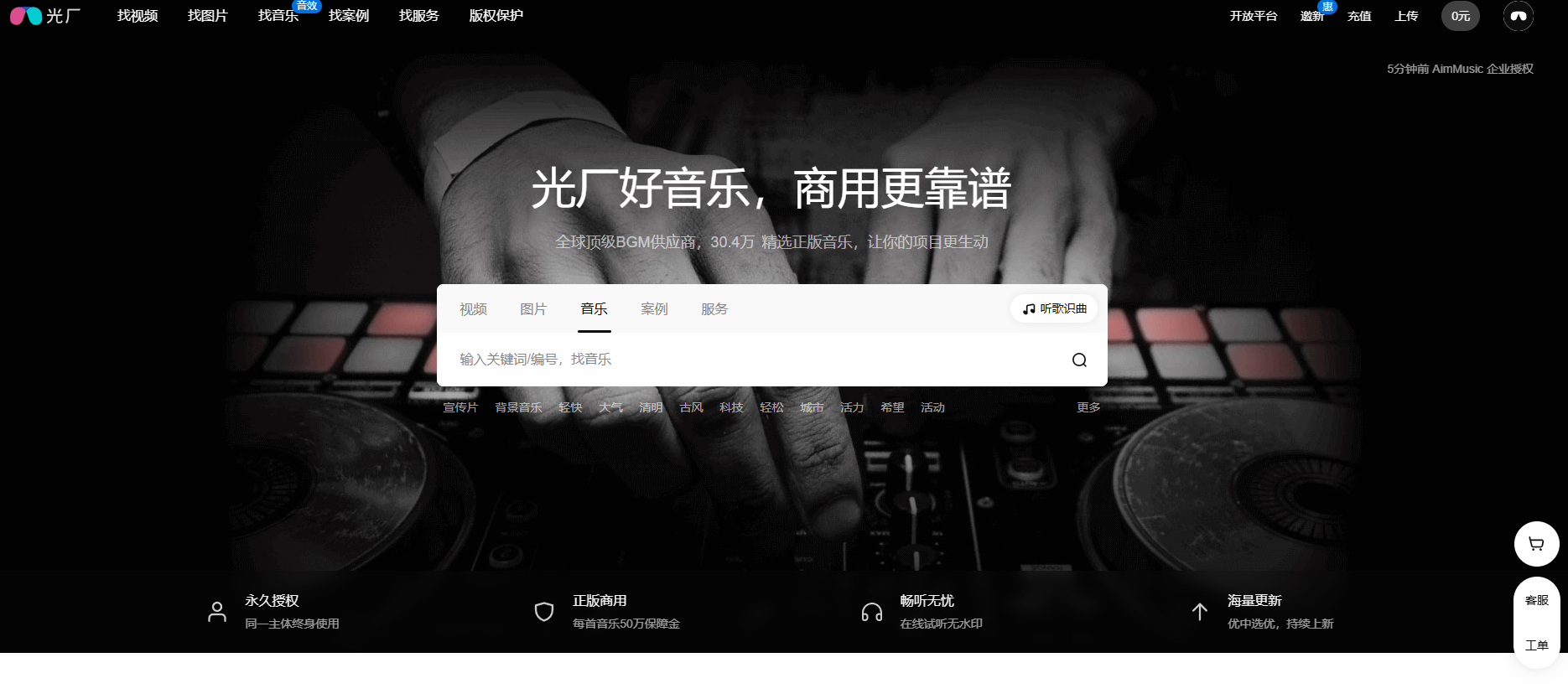 二、选择纯音乐素材平台的三大核心关注点第一,版权合规是底线,不是加分项。 2026年国内音乐侵权案件的司法力度明显加大,16秒配乐即可构成侵权并产生经济赔偿。在选择平台时,务必确认其是否提供正规授权书、授权范围是否涵盖你的使用场景、是否有法律赔付保障。光厂音乐每件素材提供50万保障金,正是对这一痛点的有力回应。