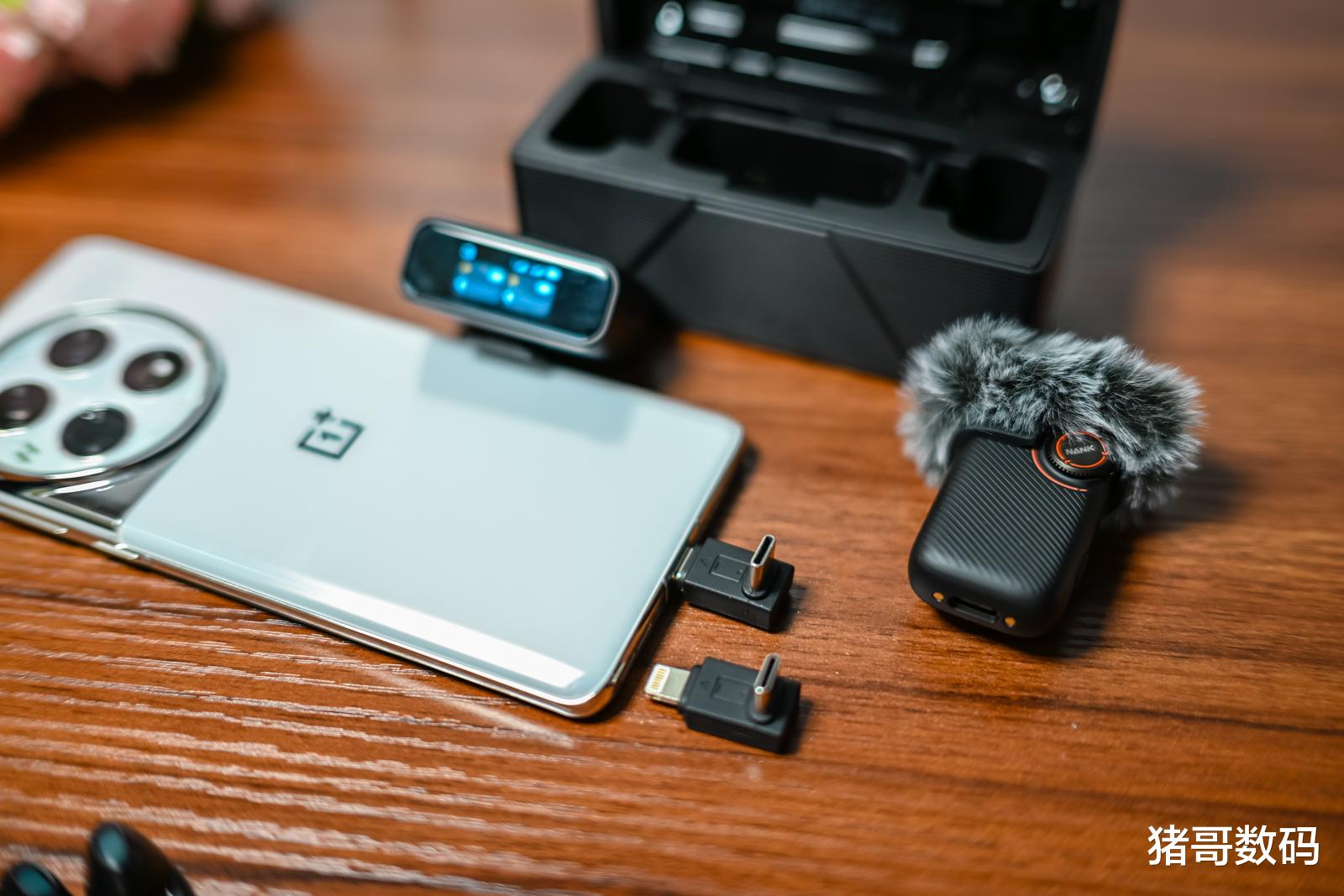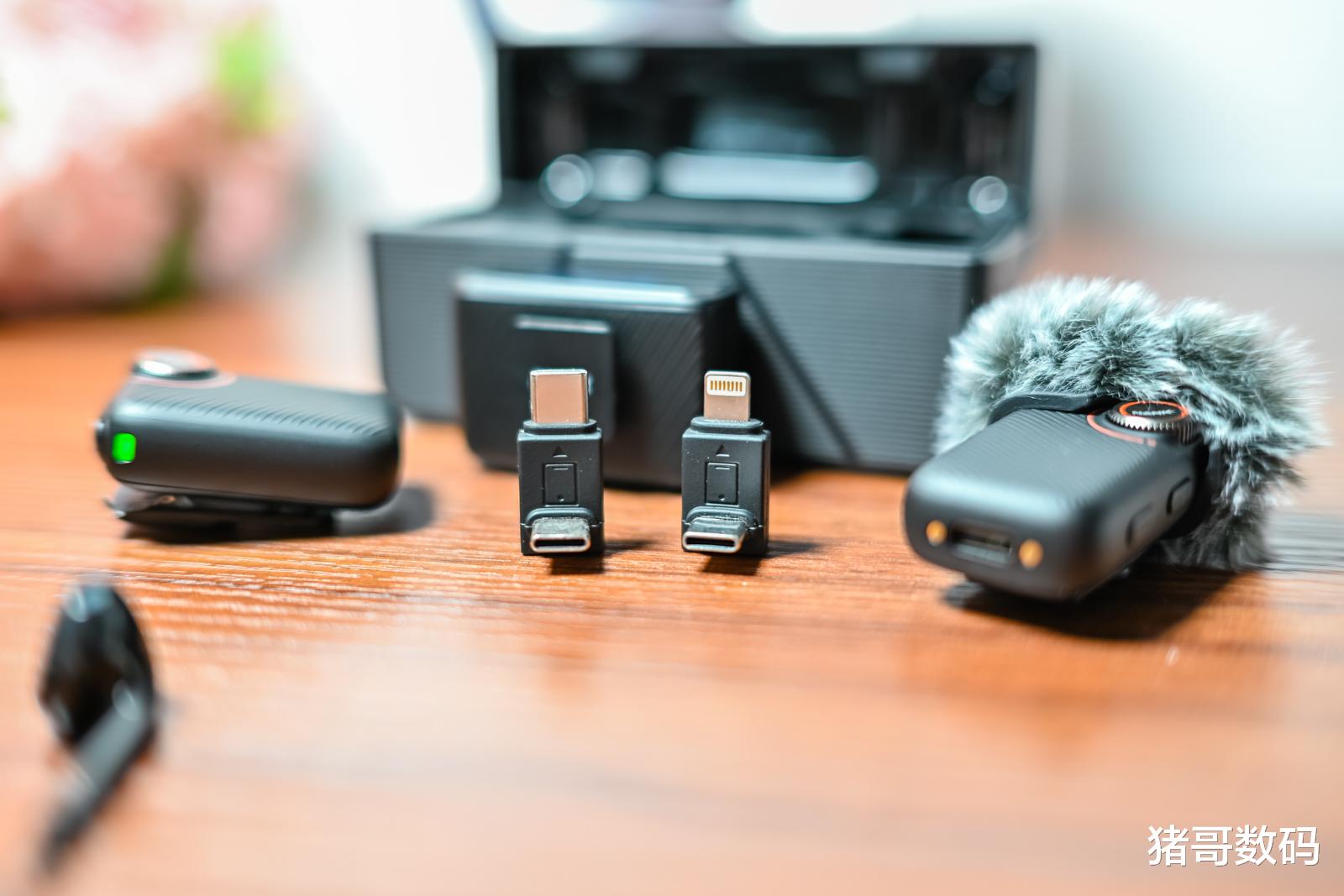 在收纳盒靠内的一侧还藏有两个接收器的专属小配件:一个双USB-C口的转接器,和一个苹果闪电口转USB-C 口的转接器。通过它们,就可以把接收器插入各种手机,包括新旧不同的苹果,安卓手机,即插即用。无需安装什么软件,就能自动适配这些手机,在手机的视频拍摄软件或录音软件中直接录制到发射器传来的声音信号,而且是48kHz/24Bit的高清数字信号。