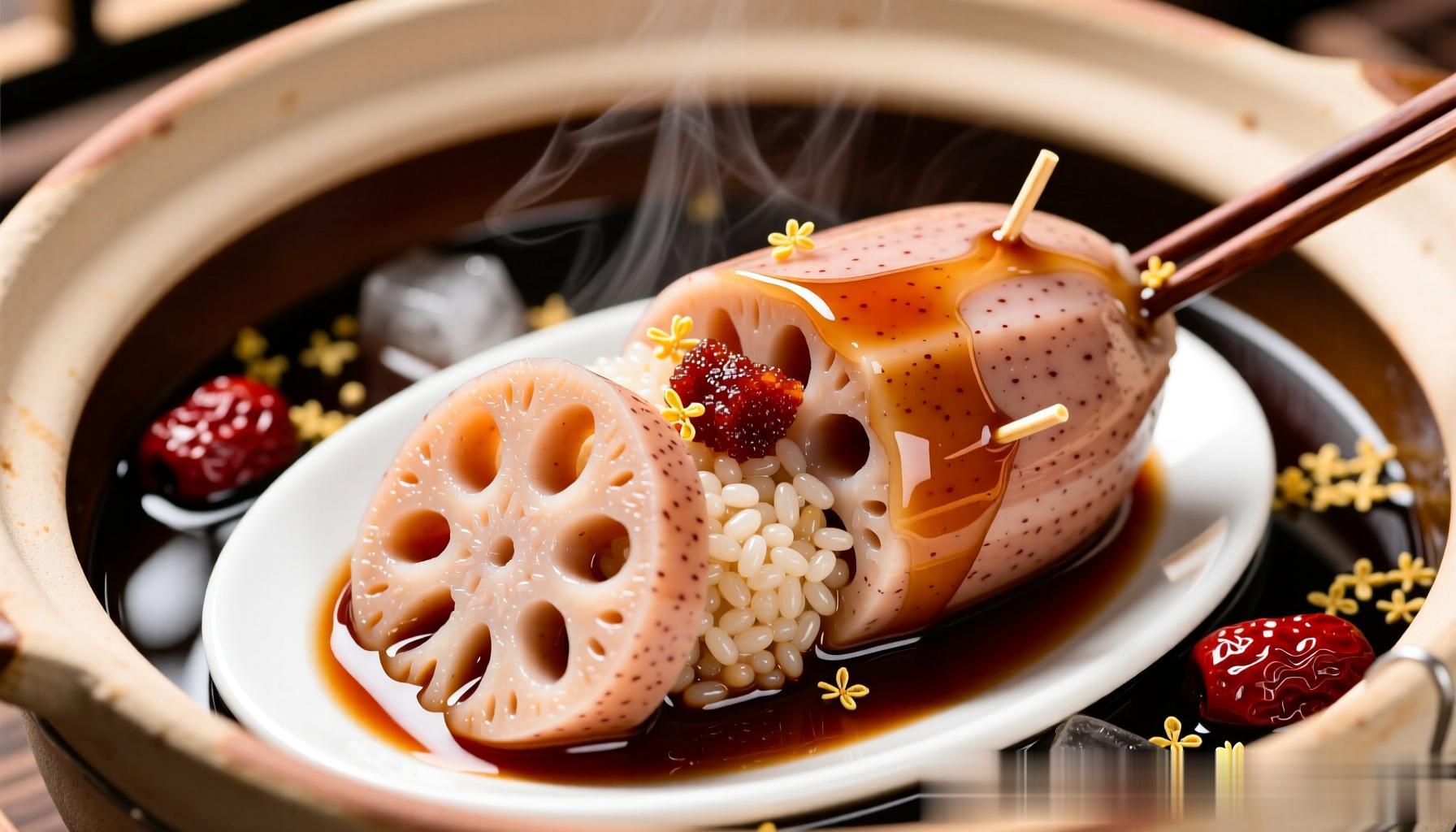 若要演绎荷花根最纯粹的养生风味,“桂花蜜汁糯米藕”堪称经典。这道甜品完美诠释了碳水与纤维的和谐共舞。制作时,需精选七孔粉藕,洗净去皮后,在一端切开作为盖子。将提前浸泡四小时以上的圆粒糯米,拌入少许红糖,细细填入藕孔之中,务必填实,再用牙签固定切口。随后,将塞满糯米的藕段放入砂锅,加入没过藕身的清水,投入冰糖、红枣及干桂花。大火烧开后转小火慢炖两至三小时,直至汤汁浓稠呈琥珀色,藕身由白转红,用筷子可轻松穿透。此时,藕的纤维已充分软化,糯米的香甜渗入藕的每一丝纹理,桂花的清香则在热气中氤氲升腾。切片装盘后,淋上锅中剩余的浓稠糖浆,一道色泽红润、软糯香甜、补气养血的佳肴便呈现在眼前。此法不仅保留了膳食纤维的完整性,更通过慢炖让复合碳水变得易于消化,老少皆宜。