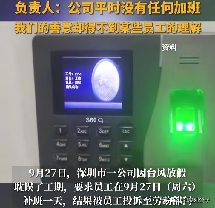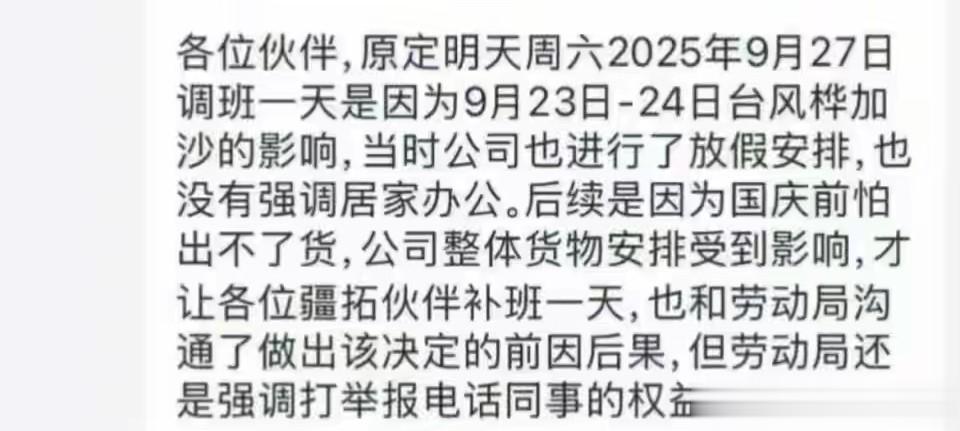 其实公司让员工星期六补班也是有苦衷的,因为9月23日至24日受台风的影响,公司考虑安全问题放假了两天。马上临近国庆假期,为了确保货物赶在物流放假前能够及时发出,公司决定让员工27日星期六补班一天,没想到却被举报了。