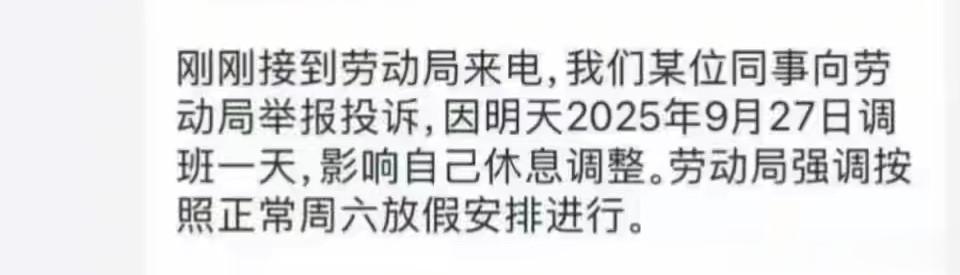 事情发生的原因是公司被自己家员工举报了,举报的理由是9月27日星期六公司要求员工调班,影响了这名员工的休息调整。