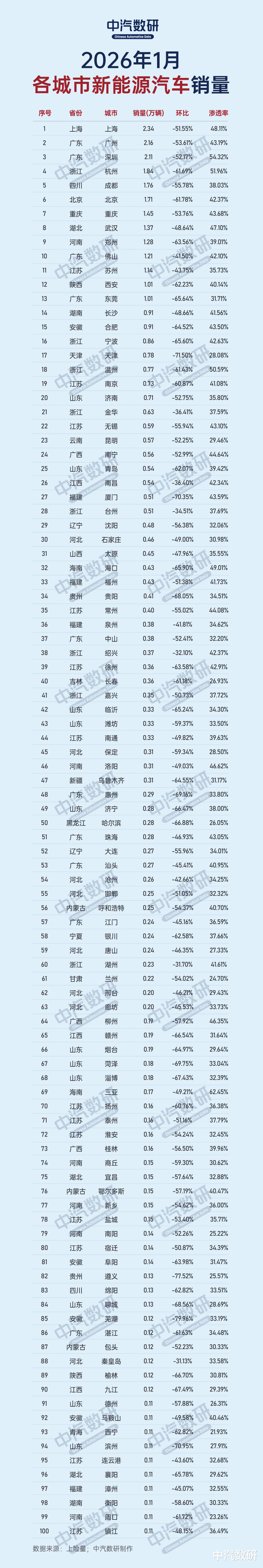 数据显示,1月国内新能源乘用车终端销量56.5万辆,环比暴跌57.6%,同比下滑19.7%,狭义乘用车市场渗透率更是回落至36.2%。