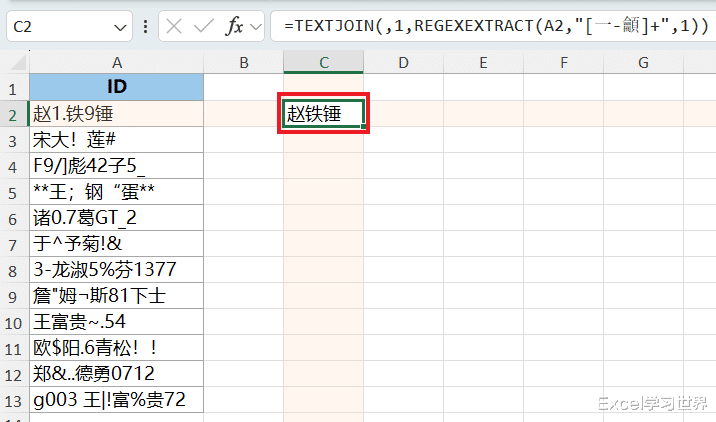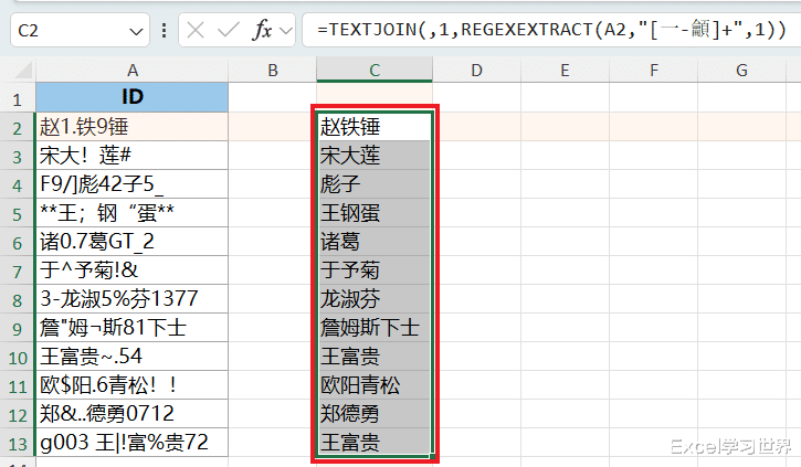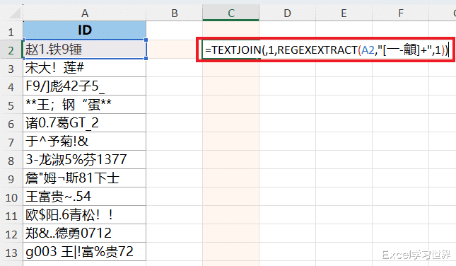 这段公式的作用是从 A2 单元格中提取出所有中文字符;