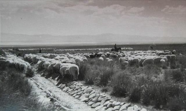1972年,青海省乌兰县茶卡公社是一个蒙、藏、汉、回、土五个民族聚居的人民公社,是青海省牧区学大寨的先进单位。近八年来,他们依靠自己的力量,先后兴建了十八项水利工程,大大改变了草原干旱缺水的面貌。图为放牧在灌渠边的羊群。