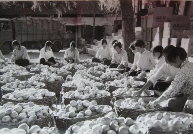 1973年,山东省烟台福山县绍瑞口大队今年一千八百多亩苹果又获丰收,其中青香蕉、红香蕉这两个品种比去年增产一百五十多万斤,这是社员们正在挑选装箱,准备外运。