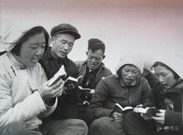 1970年,河北临西县下堡寺公社东留善固大队党支部书记吕玉兰,十几年如一日坚持学习毛泽东思想,刻苦改造世界观,带领广大贫下中农紧跟毛主席的伟大战略部署,坚定地走社会主义道路。这是吕玉兰(左一)在劳动休息时和社员一起学习《毛主席语录》。