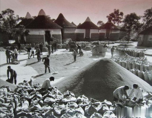1973年,在毛主席革命路线指引下,江苏省海安县又迎来了一个丰收年,这是雅周公社粮站职工在组织新粮进仓。