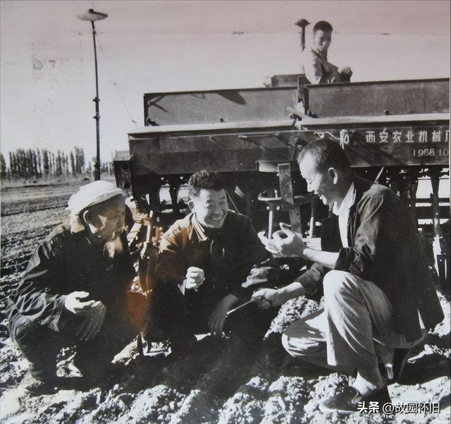 1973年,今年获得小麦丰收的山西省闻喜县河底公社,目前正抓紧时机播种冬小麦,公社党委书记赵官吉(右一)深入田间检查质量,为明年小麦丰收打下基础。