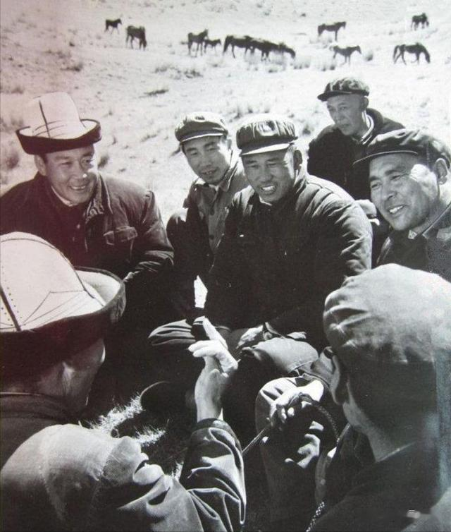 1973年,新疆新源县红星人民公社党委认真执行毛主席的革命路线和民族政策,带领社员深入开展“农业学大寨”运动,建设社会主义新农村,这是党委会各族干部和牧民交谈听取发展生产建议。