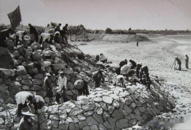 1972年,河南兰考县治黄斗争取得成效。兰考县境内的黄河大堤解放时千疮百孔,经过二十多年的修建已将土坝全部改成石坝,取得了黄河伏秋洪汛不决口的重大胜利,图为兰考东坝头人民在继续加固坝头。